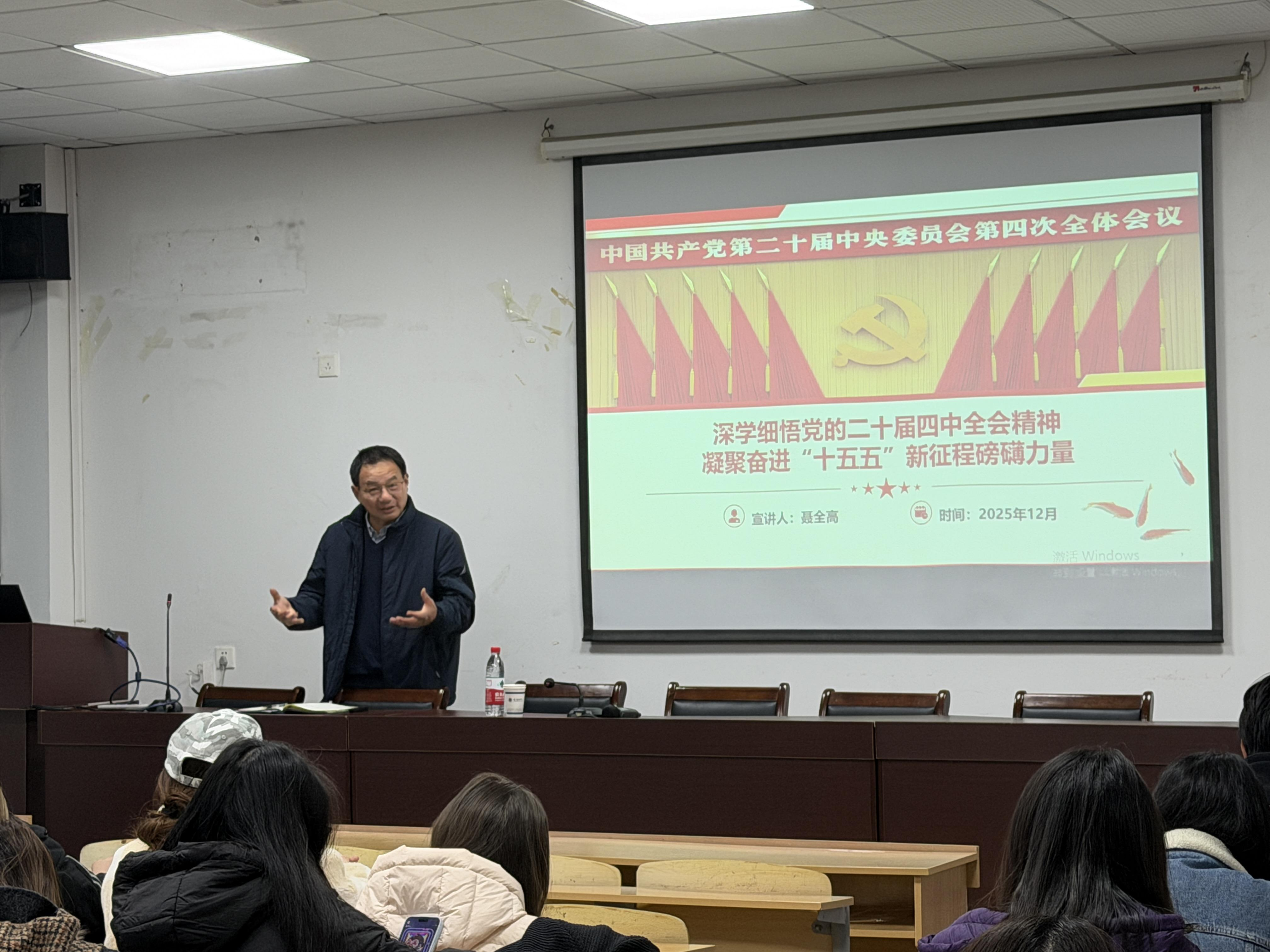 为深入学习贯彻党的二十届四中全会精神,12月18日下午,院党委书记聂全高面向联系的播音与主持艺术专业师生讲授专题形势与政策课。