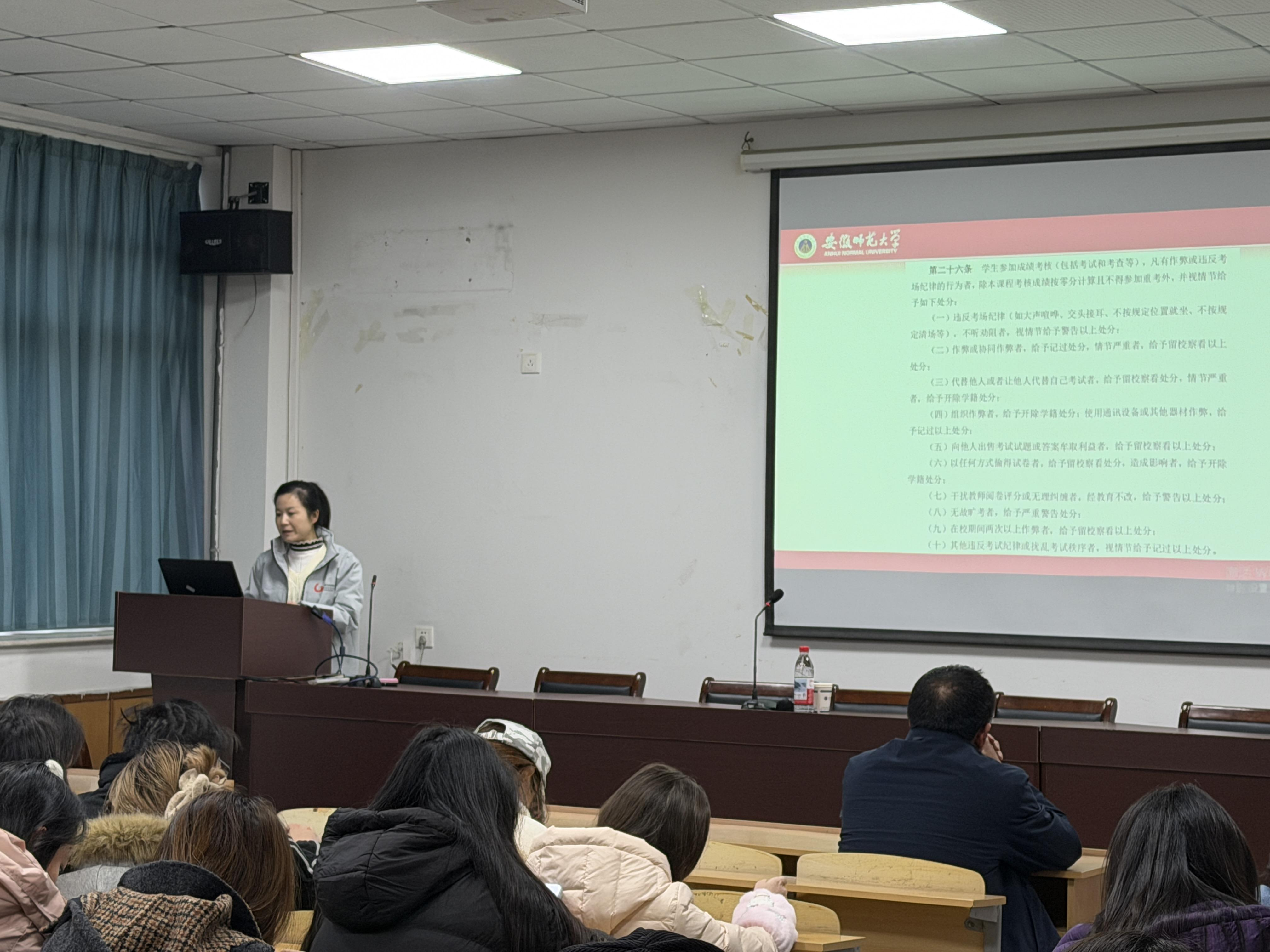 辅导员郑慧玲带领同学们系统重温了学校规章制度中关于考试纪律的核心要求,细致解读了针对抄袭、夹带、使用违规电子设备等行为的认定标准与相应处分规定。她结合以往典型案例,深入剖析了考试作弊对个人学业发展、诚信档案及长远职业生涯造成的严重危害,警示全体同学务必摒弃侥幸心理,牢固树立诚信应考意识。