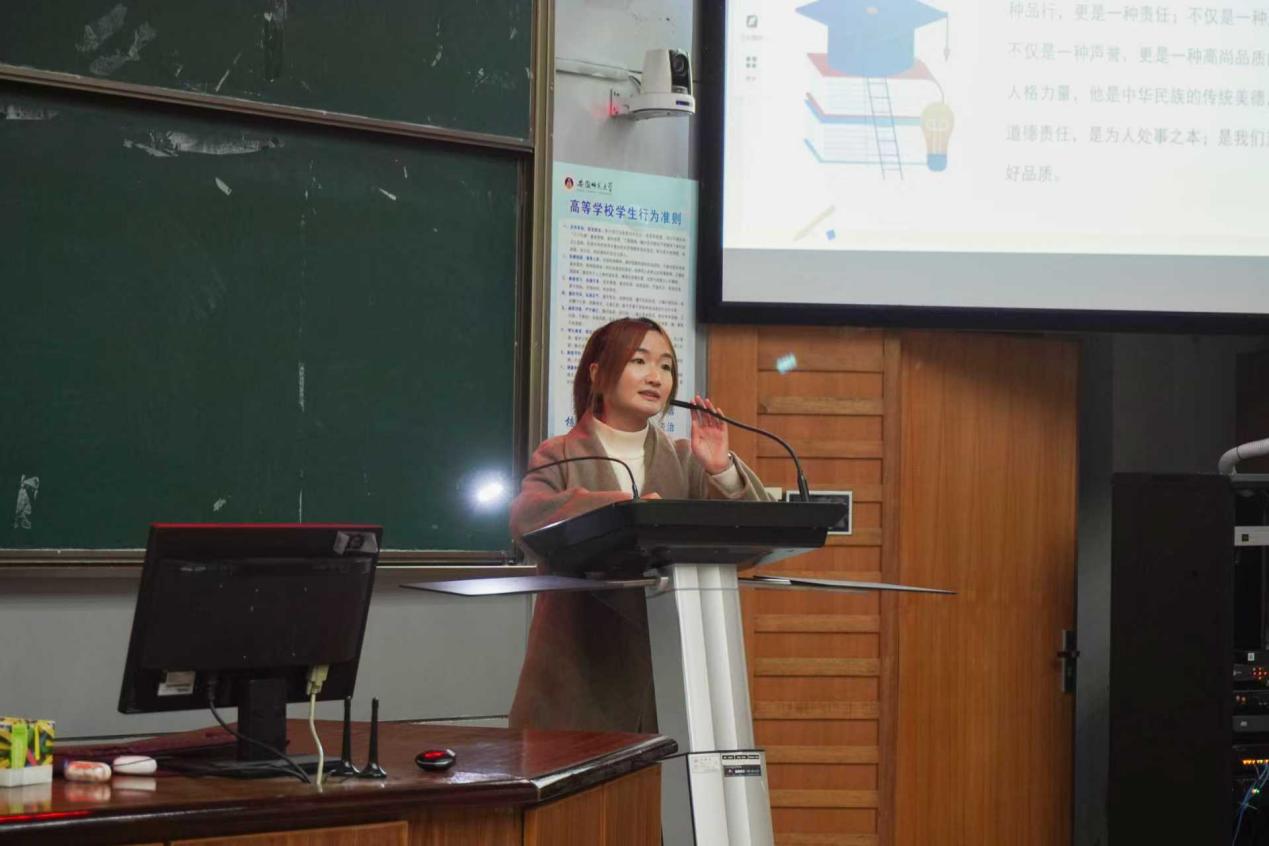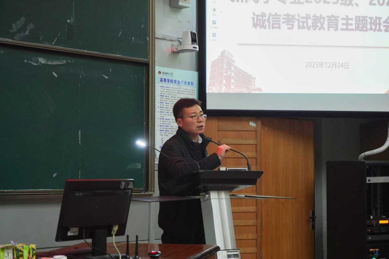 辅导员马星宇从纪律红线、个人声誉等角度对期末考试周相关纪律做出强调,以“带电高压不能做、留有污点不要做、道比魔高不敢做、诚信为人不想做、偷鸡蚀米不去做、宁愿挂科无须做”的六句箴言,直观点明作弊的潜在风险与不值,呼吁同学们坚守诚信底线,从容应考。