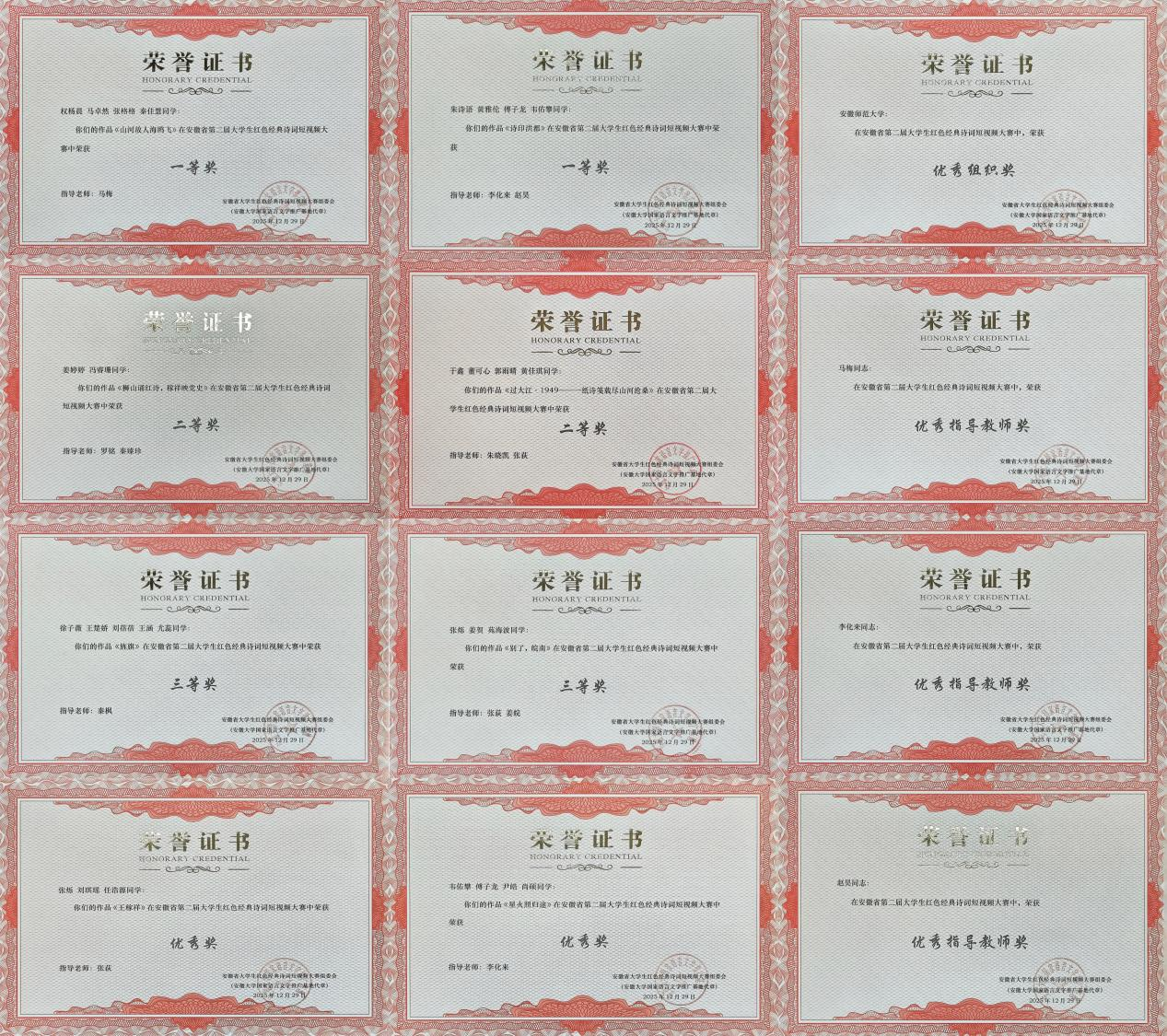 近日,安徽省第二届大学生红色经典诗词短视频大赛圆满收官。本次大赛由安徽大学国家语言文字推广基地、安徽大学新闻传播学院联合主办,新闻传播国家级实验教学示范中心(安徽大学)、安徽大学影像传播研究中心共同承办。新传学子在比赛中表现优异,共斩获一等奖2项、二等奖2项、三等奖2项、优秀奖2项;马梅、赵昊、李化来三位老师荣获“优秀指导教师”称号。同时,我校亦获评“优秀组织奖”。