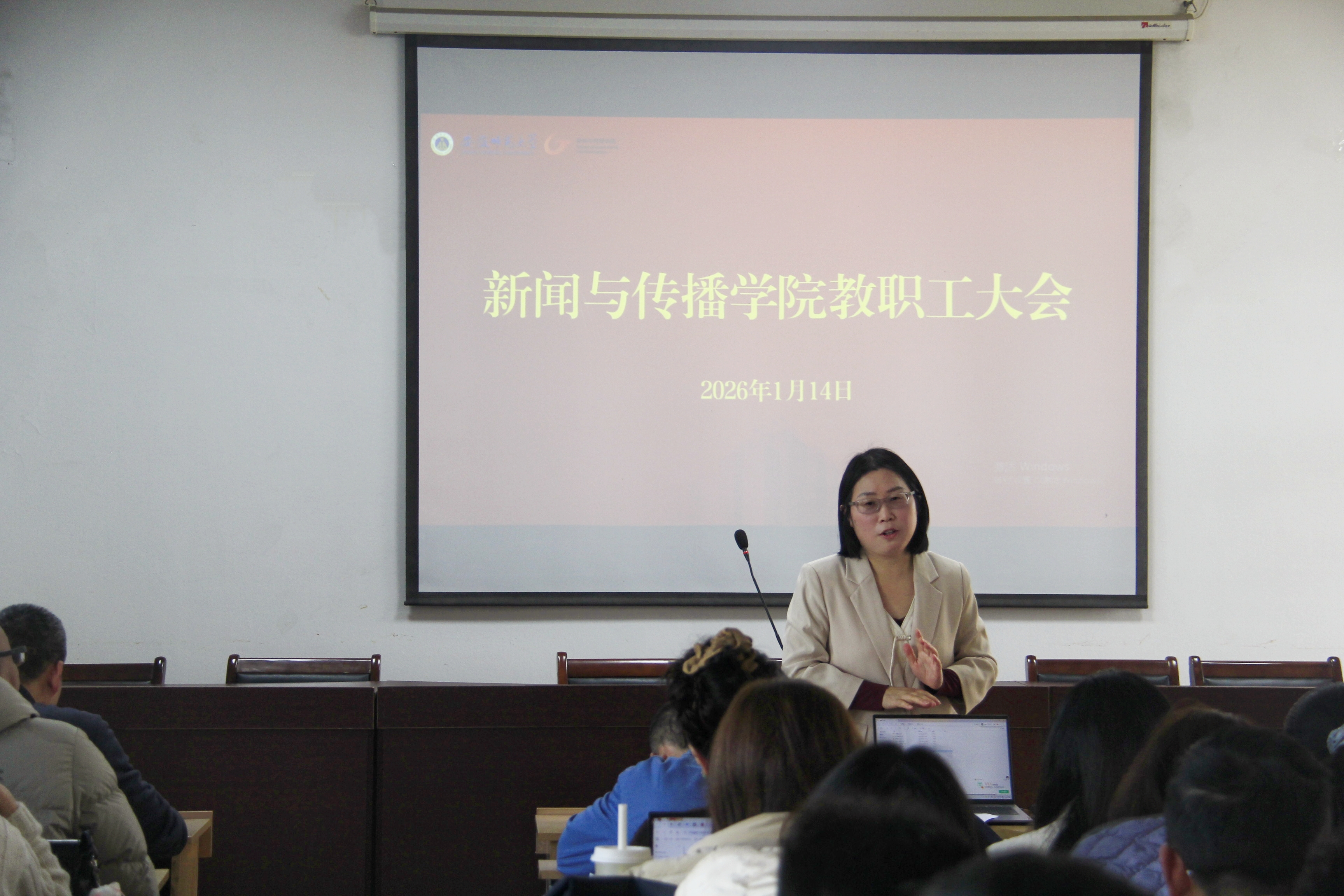 执行院长马梅通报了学院近期重要事项。她重点强调了教职工因私出国境的管理规定与纪律要求,并代表学院领导班子作2025年度工作述职,总结党建与事业发展成效,分析现存问题,并对寒假及新学期相关工作提出整体展望。