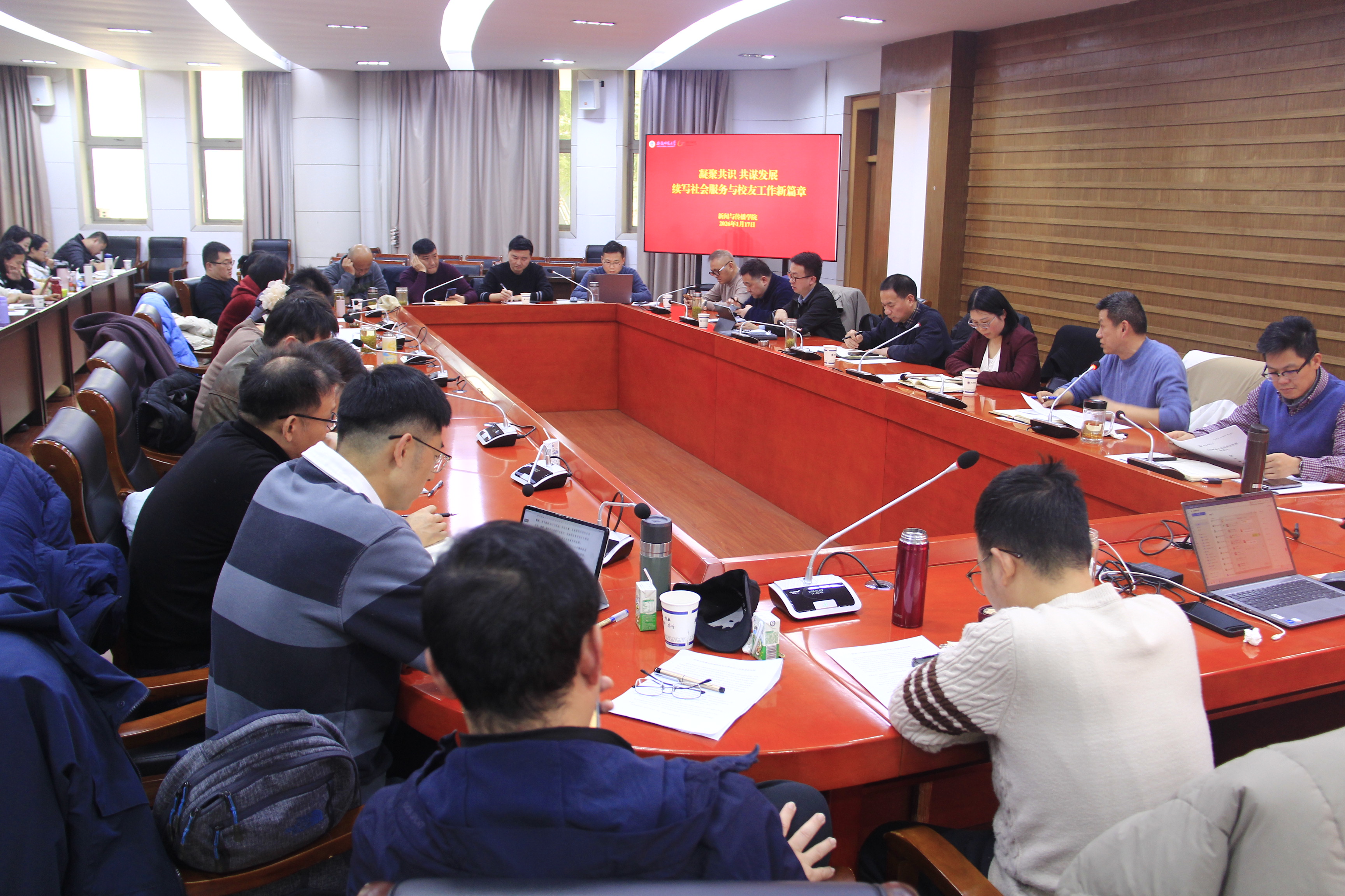 聚焦社会服务与校友联动,共拓发展新空间。社会服务与校友工作务虚会上,大家集体学习了安徽省关于支持文化高质量发展及发挥高校优势推动文化发展的最新政策精神。在交流研讨环节,与会人员结合学科专业特色,热烈探讨了学院服务经济社会发展的优势领域、可行形式与实施路径;深入研究了非学历教育培训的运行机制建设、专家团队与资源库打造、项目拓展策略;共同谋划了具有新传特色的校友品牌活动设计与常态化联络机制。会议旨在整合资源、创新模式,进一步提升学院的社会贡献力与校友凝聚力。