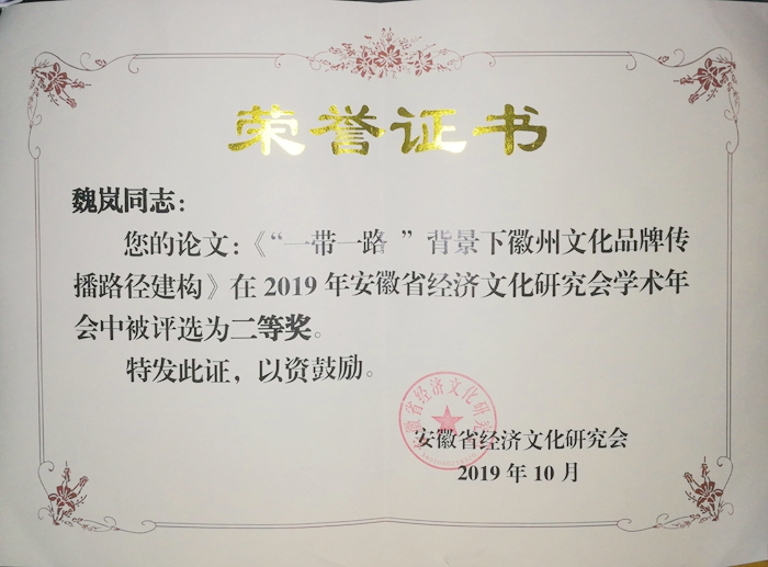 bat365在线中国登录入口教师魏岚、杨帆参加了会议。魏岚提交的论文《“一带一路”背景下徽州文化品牌传播路径建构》获得优秀论文二等奖,并颁发了证书。