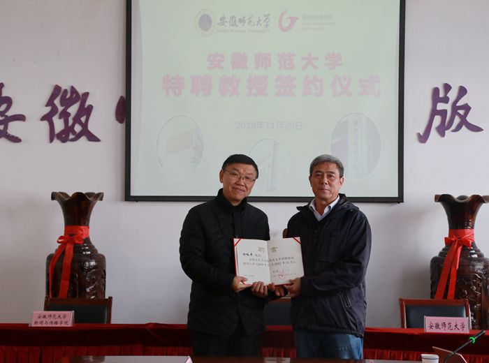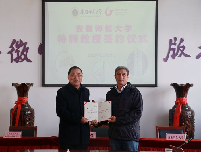 11月29日,学校举行特聘教授签约仪式,聘请南京大学新闻传播学院博士生导师丁柏铨、原人民日报社安徽分社社长刘杰、华中科技大学新闻与信息传播学院博士生导师舒咏平为特聘教授。校党委常委、副校长朱家存,人事处处长朱为民、bat365在线中国登录入口党政领导班子及教授委员会成员出席了签约仪式。仪式由bat365在线中国登录入口执行院长杨柏岭主持。