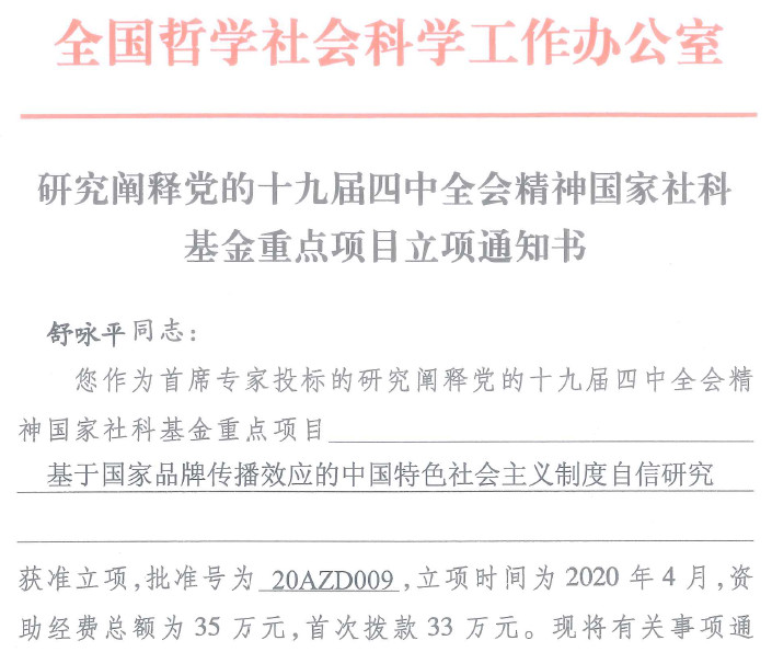 近日,接全国哲学社会科学工作办公室立项通知,bat365在线中国登录入口柔性人才舒咏平教授申报的研究阐释党的十九届四中全会精神国家社科基金重大项目转为重点项目立项,立项后的项目名称为“基于国家品牌传播效应的中国特色社会主义制度自信研究”,项目批准号为20AZD009,资助经费为35万元,这是bat365在线中国登录入口获批立项的首个国家社科基金重点项目。