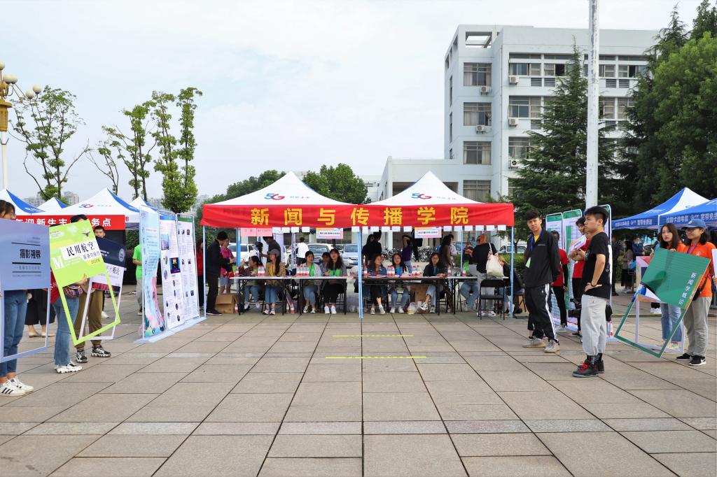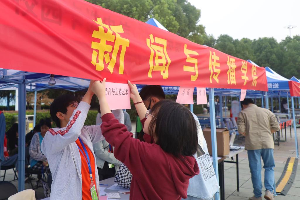 迎新活动现场,新生报到井然有序。新生根据提示牌的指引,找到相应专业报到处,递交录取通知书,领取校园卡、寝室钥匙、辅导员致新生的一封信等,人脸识别录入“大数据”统计,志愿者送寝,一系列动作迅速快捷。迎新帐篷内,无论是写有学长学姐祝福的明信片,还是贴有新传特制标签的矿泉水、各专业书籍式样的KT板、介绍院情的展架,安插在每一处的小细节都饱含着学院对于新生的祝福与期待。