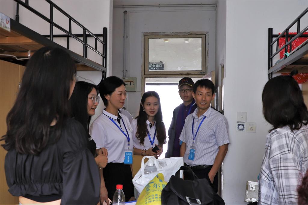 迎新现场,学院领导来到现场对工作进行指导,深入新生宿舍了解报道情况。
