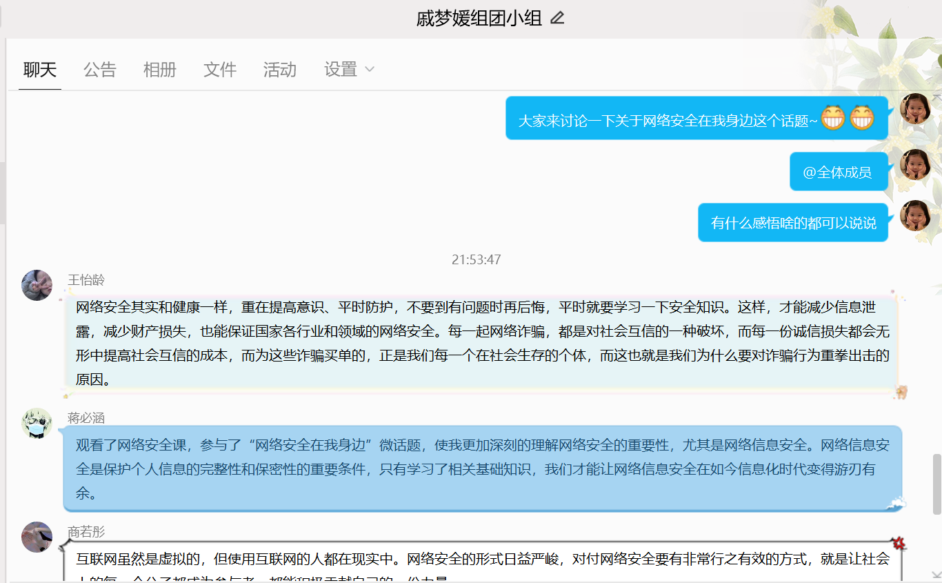 同上一堂课,共筑安全防线。9月15 日上午10时,教育部思政司组织录制“聚力青春守护安全”网络公开课,通过新华网、央视网、腾讯新闻、哗哩哗哩、快手、新浪新闻、中国大学生在线等平台在线播放。此外,中国大学生在线将开辟网络安全专栏,遴选一批慕课课程,主要内容包括了解各类媒介的特点和使用方法、理性看待媒介中的信息、信息甄别、正确使用、生产和传播媒介产品等。新传学子积极响应号召,主动观看网络公开课并展开热烈讨论。