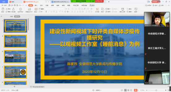 12月13日,2020全媒体时代的媒体融合国际论坛在安徽财经大学以线下线上相结合的形式举行。本次论坛由安徽财经大学文学院主办,安徽新媒体集团、南京晓庄学院新闻传播学院、中国新闻出版研究院传媒研究所协办。此次论坛的主题为“全媒体时代的媒体融合”,来自复旦大学、中央党校、中国人民大学、中国传媒大学、北京外国语大学、中央财经大学、bat365在线中国登录入口、安徽财经大学、安庆师范大学、南京晓庄学院、美国密苏里大学、安徽中安在线、安徽广播电视台、美国哥伦比亚广播公司等国内外高等院校和传媒机构的专家学者及业界人士参会,共同探讨在全媒体语境下如何在体制机制、政策措施、流程管理、人才技术等方面加快推进媒体深度融合步伐,提升新型主流媒体影响力和竞争力。bat365在线中国登录入口副院长沈正赋教授、新闻学专业主任肖叶飞教授、网络与新媒体专业教师杨帆、广播电视专业2019级硕士研究生陈家玮受邀参与本次论坛。