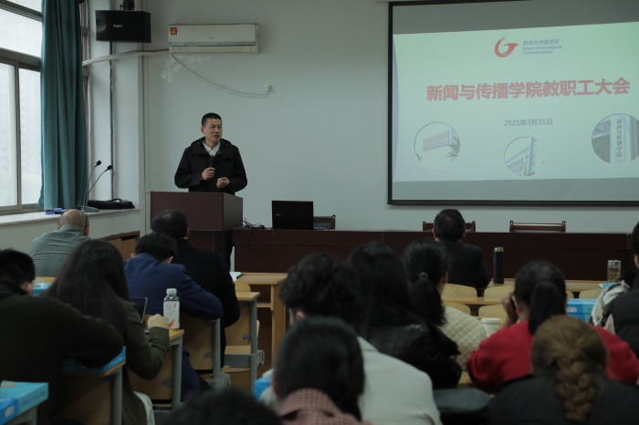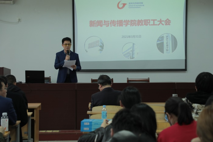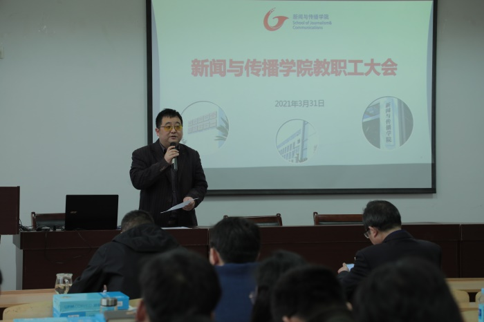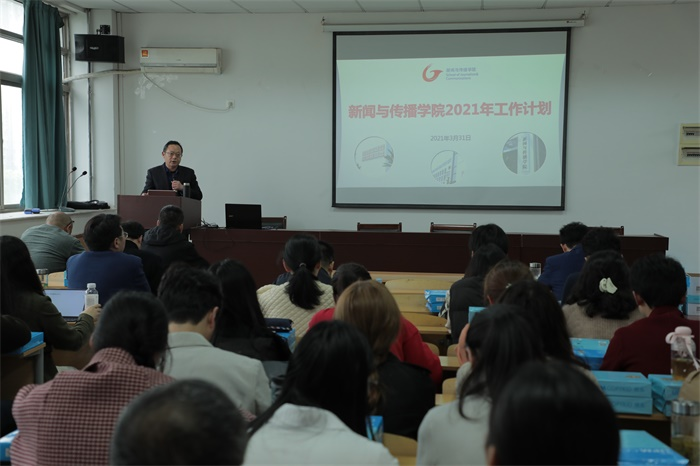 会上,执行院长杨柏岭对学院2021年工作计划进行详细解读。他指出要以高质量推进部校共建新闻学院和学院“双一流”建设为牵引,深入实施文化引领、内涵融合、转型升级、人才强院战略,认真落实《学院“十四五”规划》《班子任期目标》确定的各项任务,努力实现建设一流新闻学院、培养卓越新闻传播人才的目标。实现目标的具体要求包括五个要点:政治铸魂、党员垂范,持续推进党建内涵式建设;融合升级、卓越为要,深入探索人才培养品质化的路径;学科引领、强化内涵,全面提升科研与学科建设水平;立德树人、求实求新,稳步提升思政水平和育人成效;科学管理、提升效能,不断优化学院的文化生态。