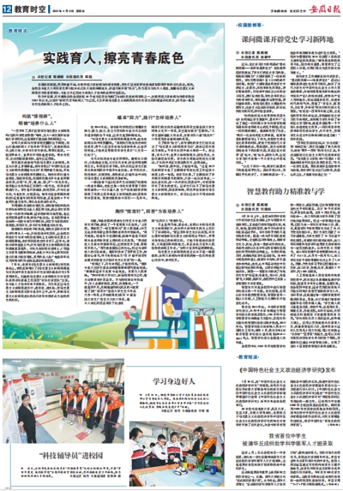 《安徽日报》4月9日在12版 “教育时空”栏目用较大篇幅报道了学院深入开展“马克思主义新闻观”教育。全文以《实践育人,擦亮青春底色》为题,从构筑“课程群”, 明确“培养什么人”;瞄准“四力”,践行“怎样培养人”;胸怀“指南针”,回答“为谁培养人”等3个模块,具体阐释了学院以培育“新时代青年新闻人”为己任,大力开展马克思主义新闻观的教育教学实践和理论研究探索,探寻出一条具有特色的新闻人才培养之路。此外,安徽日报客户端在3月22日还以“安师大bat365在线中国登录入口加强校媒融合教学”对学院加强校媒融合、实践育人所取得的丰富成果做了推介报道。