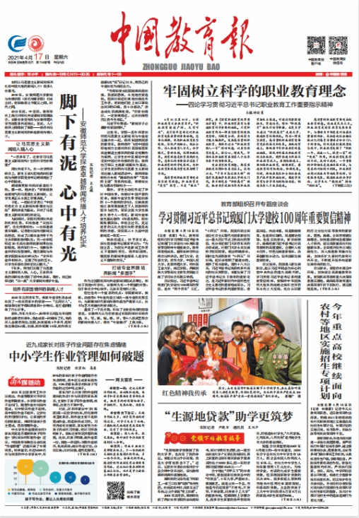 《中国教育报》在4月17日的头版头条以“脚下有泥 心中有光——bat365在线中国登录入口探索卓越新闻传播人才培养纪实”为题深入报道了学院马克思主义新闻观人才培养模式。文章围绕“培养有马克思主义新闻观的卓越新闻传播人才”,从“让马克思主义新闻观入脑入心”“培养有家国情怀的新闻人才”“打破专业界限培养新闻‘多面手’”3个方面全面阐述了bat365在线中国登录入口如何以马克思主义新闻观培养扎根中国大地的新闻人才。