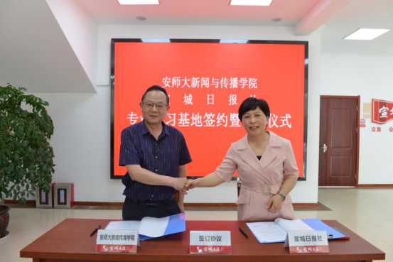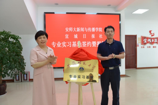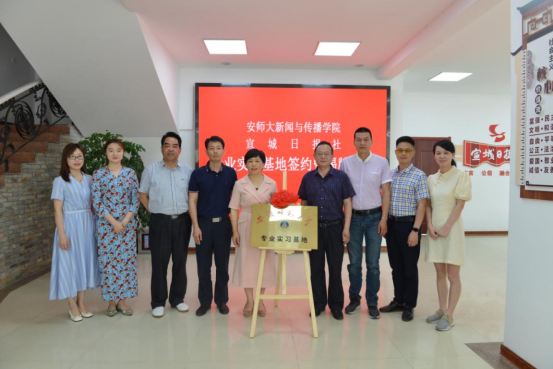 座谈开始前,学院与宣城日报社就专业实习基地举行了隆重的揭牌仪式。仪式由洪建民主持,在双方出席人员的共同见证下,杨柏岭与王建玲代表双方签订专业实习基地共建协议书。在热烈的掌声中,张师帅与王建玲代表双方揭牌,本着资源共享、相互协作、互惠互利、共同发展的原则,实习基地的建立为学院搭建了应用型平台。随后,学院一行参观了日报社“宣城市融媒体中心”以及报社编辑部等部门。据了解,目前日报社已经形成一报、一刊、一网、一端、两微、三号的全媒体平台,发行量2万余份,7个新媒体平台24小时滚动发布信息,日均发稿量130余篇次,移动端用户总数50万。