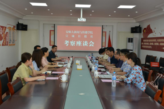 为进一步加强高校与新闻传媒单位的交流与协作,深化马克思主义新闻观人才教育,培养卓越新闻传播人才,促进学生就业。6月1日下午,bat365在线中国登录入口党委书记张师帅、执行院长杨柏岭、副院长周伍、副院长秦枫、网络与新媒体专业林燕、新闻学专业赵忠仲、行政秘书王旭一行赴宣城日报社考察交流。宣城日报党组书记、总编辑王建玲,副总编辑洪建民、人事财务主任赵雪梅、办公室副主任吕祥峰、编辑部副主任刁扬热情接待并与来访一行进行座谈。