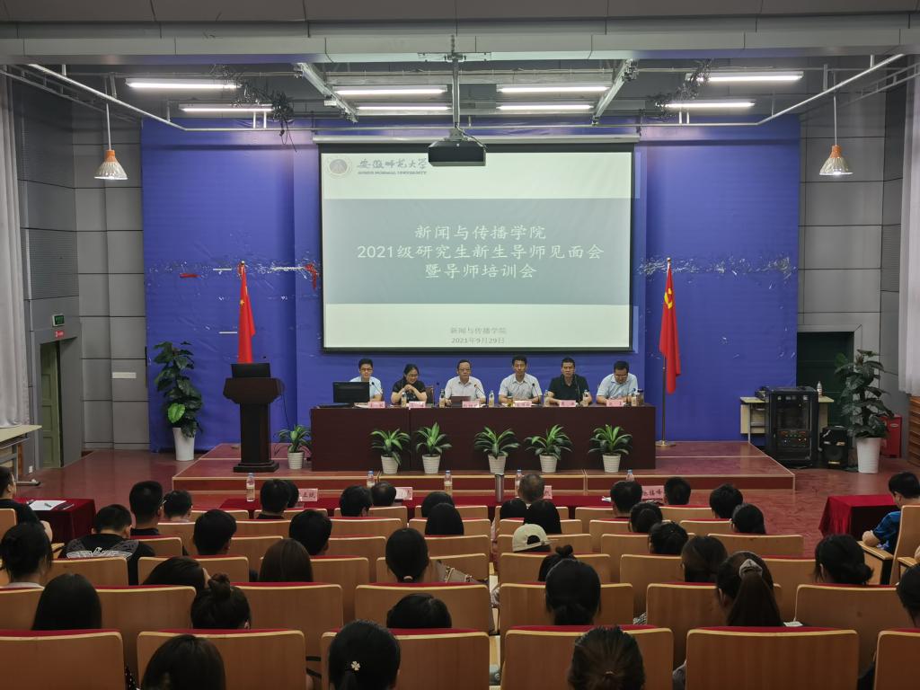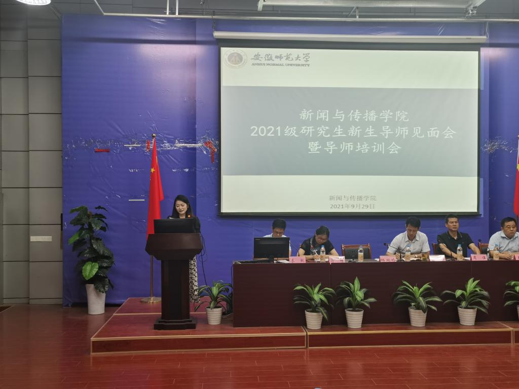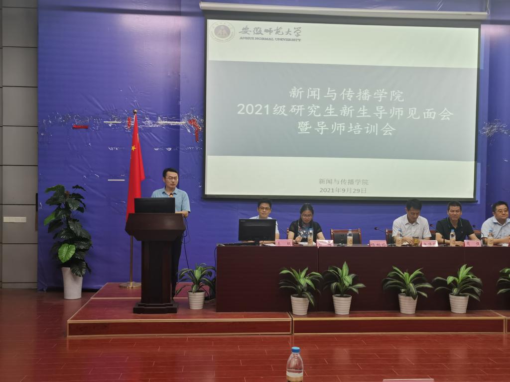 本网讯(bat365在线中国登录入口 曹寅飞 丁纪)2021年9月29日,bat365在线中国登录入口2021级研究生新生导师见面会暨导师培训会在教学楼2010307召开。学院党委书记张师帅、党委副书记、执行院长、戏剧与影视学学位点负责人杨柏岭、副院长周伍、马梅、赵昊、教授委员会主任丁云亮、新闻传播学学位点负责人、图书馆馆长沈正赋、新闻与传播专硕学位点负责人朱晓凯、广播电视专硕学位点负责人陈接峰及各专业研究生导师、研究生辅导员、研究生秘书、2021级全体研究生参会,会议由副院长秦枫主持。