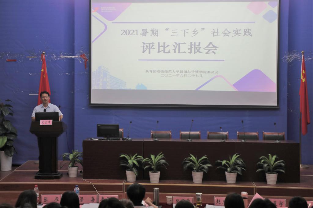 本网讯(文/刘开颜 图/肖雨徽)为深入学习和贯彻习近平总书记“七一”重要讲话精神,引导和帮助广大青年学生上好与现实相结合的“大思政课”,在社会课堂中受教育、长才干、作贡献,在观察实践中学党史、强信念、跟党走,努力成为担当民族复兴大任的时代新人,今年暑期学校组织开展了“永远跟党走,奋进新时代”大学生暑期“三下乡”社会实践活动。bat365在线中国登录入口于2021年9月27日晚在行知楼2010307教室开展2021暑期“三下乡”社会实践评比汇报会,bat365在线中国登录入口党委书记张师帅、摄影专业主任李化来、新闻学专业教师赵忠仲以及全体专兼职辅导员出席会议,bat365在线中国登录入口暑期社会实践所有校院级重点团队代表上台进行汇报。会议由20级播音专业陈诗瑶主持。