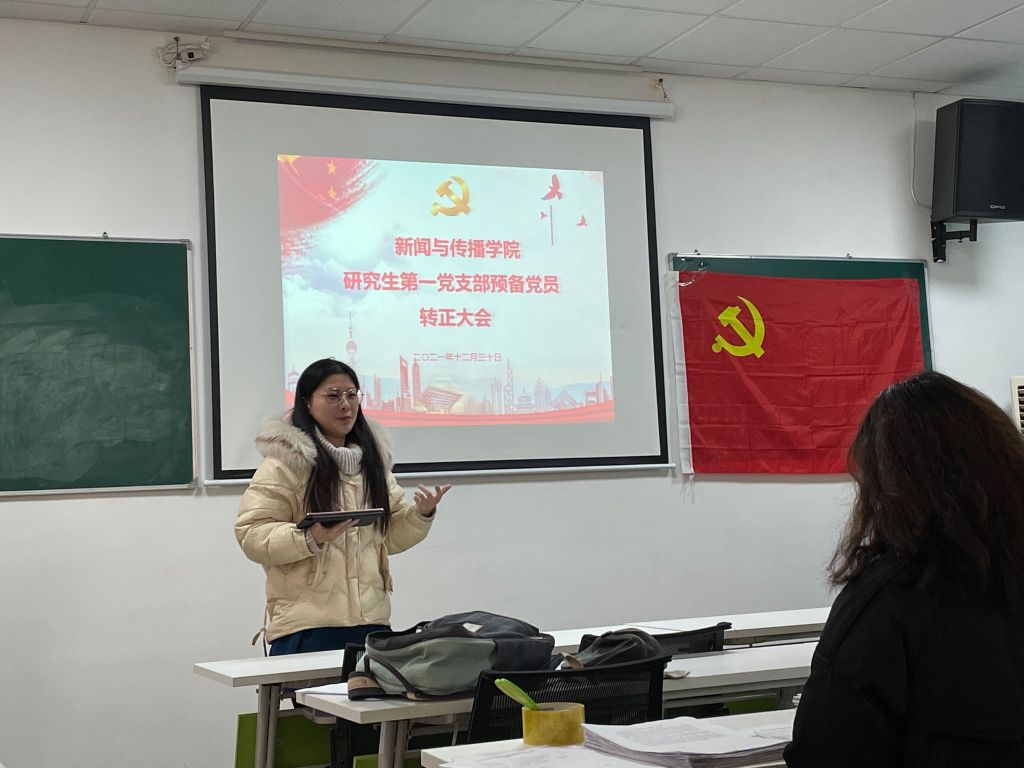 bat365在线中国登录入口研究生第一党支部预备党员转正大会在庄严的国歌声中开始。支部书记葛老师首先就预备党员转正的组织原则、会议流程及党员发展相关事宜做了详细说明。