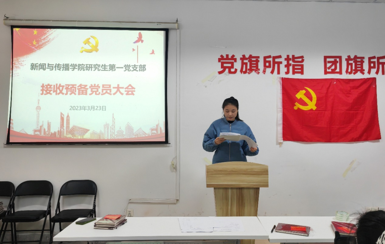 接收预备党员大会开始,全体党员起立,奏唱国歌。陈甜甜、朱虹洁、张书、王雅文四位同学逐个汇报了本人对党的认识、个人情况以及作为积极分子期间的表现,既肯定了成绩,也找出了自己目前存在的缺点与不足,向党组织表明自己入党的态度和决心。四位同学的入党介绍人和培养联系人依次发言,结合该发展对象的实际表现对其能否入党表明了意见。