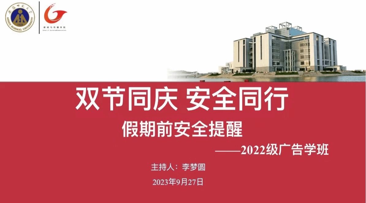 为保障同学们的生命安全和财产安全,度过一个充实而有意义的中秋国庆小长假。9月27日晚,2022级新闻学、广告学、网络与新媒体、播音与主持艺术专业开展假期前安全教育主题班会,会议由辅导员李梦圆主持。