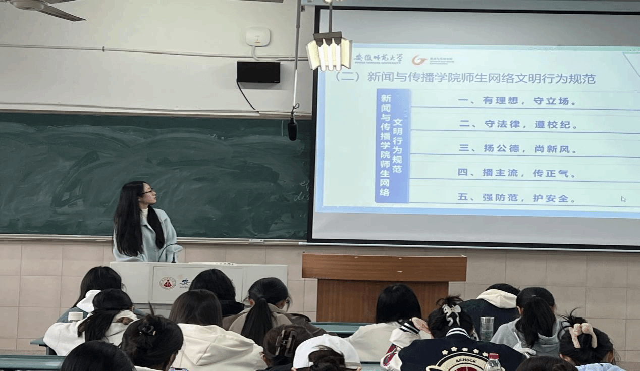 会议进行到中程,米倩瑶、蔡雯向全体同学号召:青年大学生应该传播正能量,我们要做有社会情节的“思想家”、有担当的“谋略家”、信念坚定的“实干家”、民族复兴的“种花家”。接触信息要软硬兼施,也就是了解软新闻和硬新闻。软新闻和人们的切身利益无直接关系,主要向受众提供娱乐、开阔眼界、增长知识、陶冶情操。硬新闻关系到国计民生以及人们切身利益的政治、经济、科技类的新闻。信息要洞若观火,自己去寻找信息比如学校官网,公众号等等。传播信息要“形神具备”,米倩瑶、蔡雯向大家举例我校学子郭昊,他拍摄的短视频向世界展示了我国宏村地区的绝色景象。米倩瑶、蔡雯总结道:“我们应遵守bat365在线中国登录入口师生网络文明行为规范:一、有理想,守立场。二、守法律,遵校纪。三、扬公德、尚新风。四、播主流,传正气。五、强防范,护安全。内化于心,外化于形。”