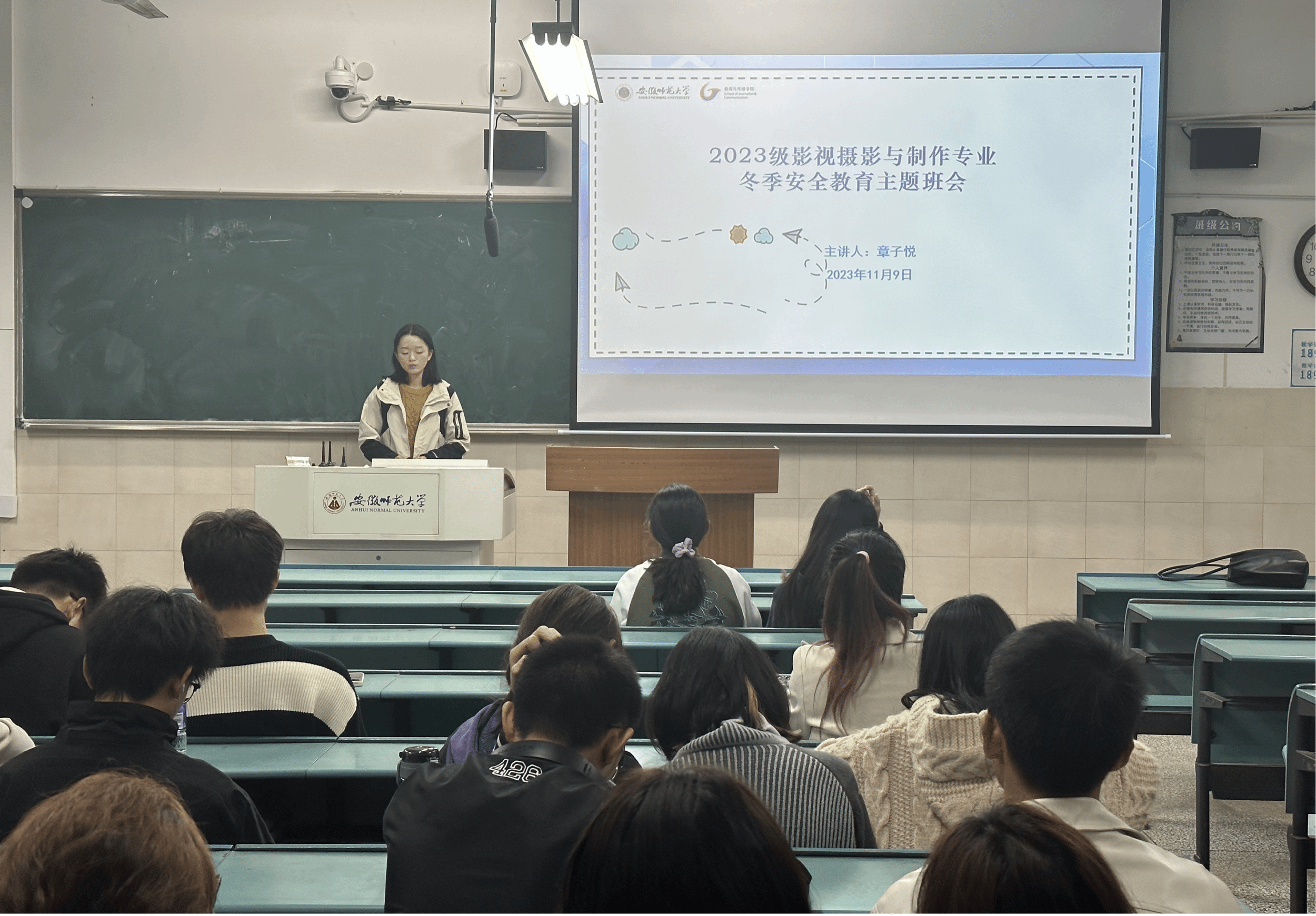 凛冬已至,气温骤降。为加强学生冬季宿舍安全用电意识、普及宿舍用电安全相关知识与要求。11月9日晚,2023级影视摄影与制作专业召开冬季安全教育主题班会,会议由辅导员章子悦主持,2023级影视摄影与制作专业全体同学参加。