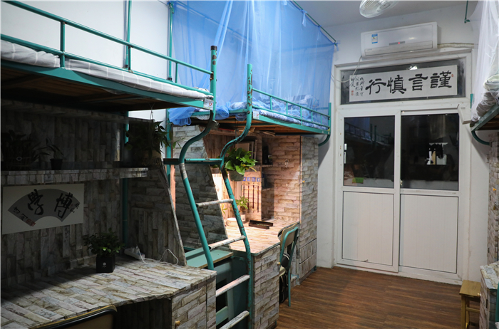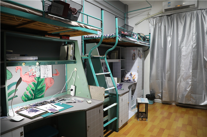 评选中也不乏学生将自己的才艺特长融于寝室设计中,而手绘字画则成为了其中装饰寝室的首选。47栋412寝室用手绘漫画的方式装点白色墙壁,给略显单调的寝室增添了几分俏皮的气息。18栋401寝室则利用自己的书法特长,书写多幅字帖挂于墙壁,黑色的毛笔字在白色墙壁的映衬下显得格外苍劲有力。另有摄影、动画专业的学生将自己的绘画小作品贴于柜门,还有不少寝室在书桌上摆放吊篮、绿植;或将寝室成员的合照挂在墙上,让寝室多了一丝家的感觉。这些微小的细节都为整个寝室的设计增添了亮点。
