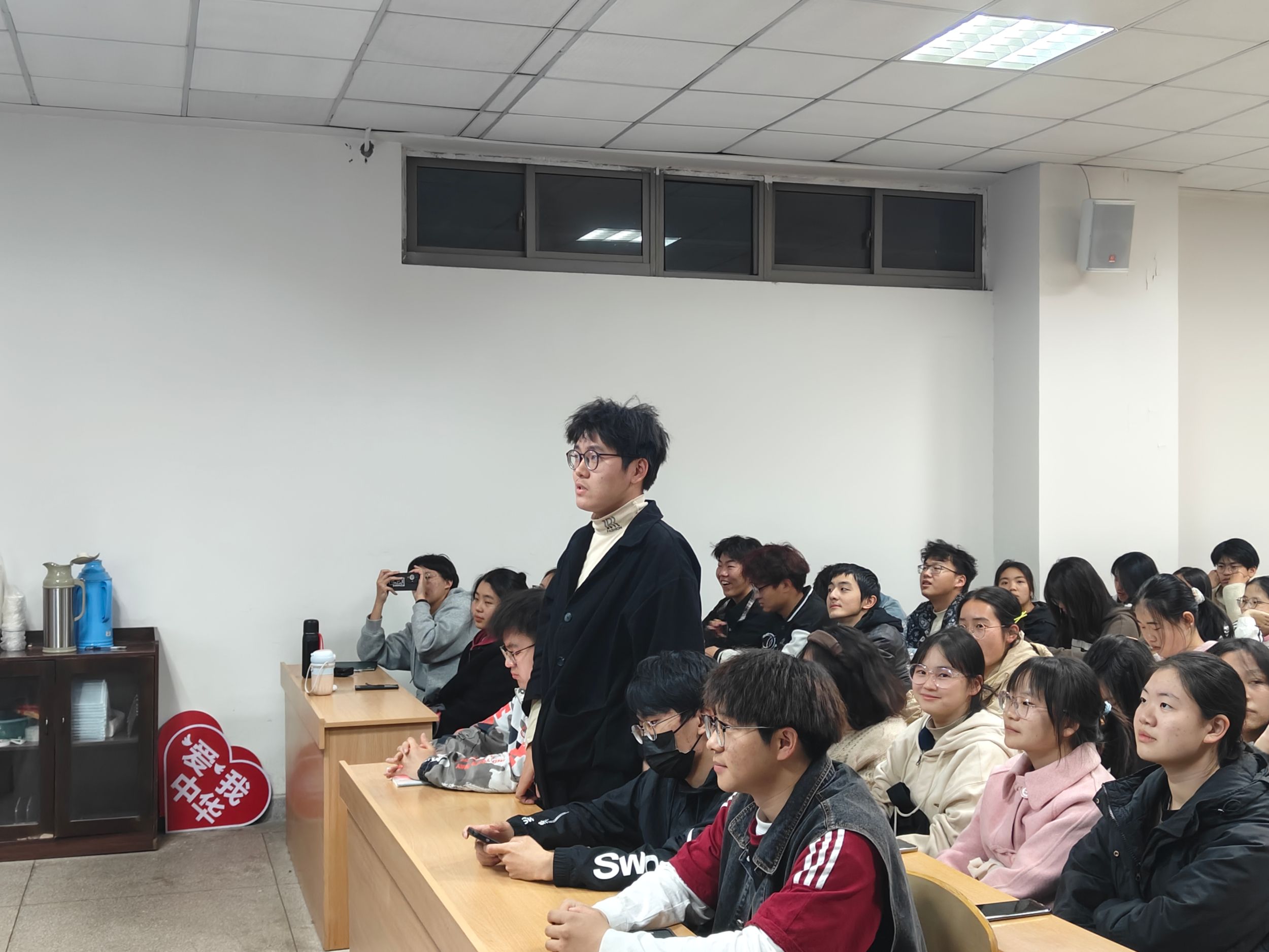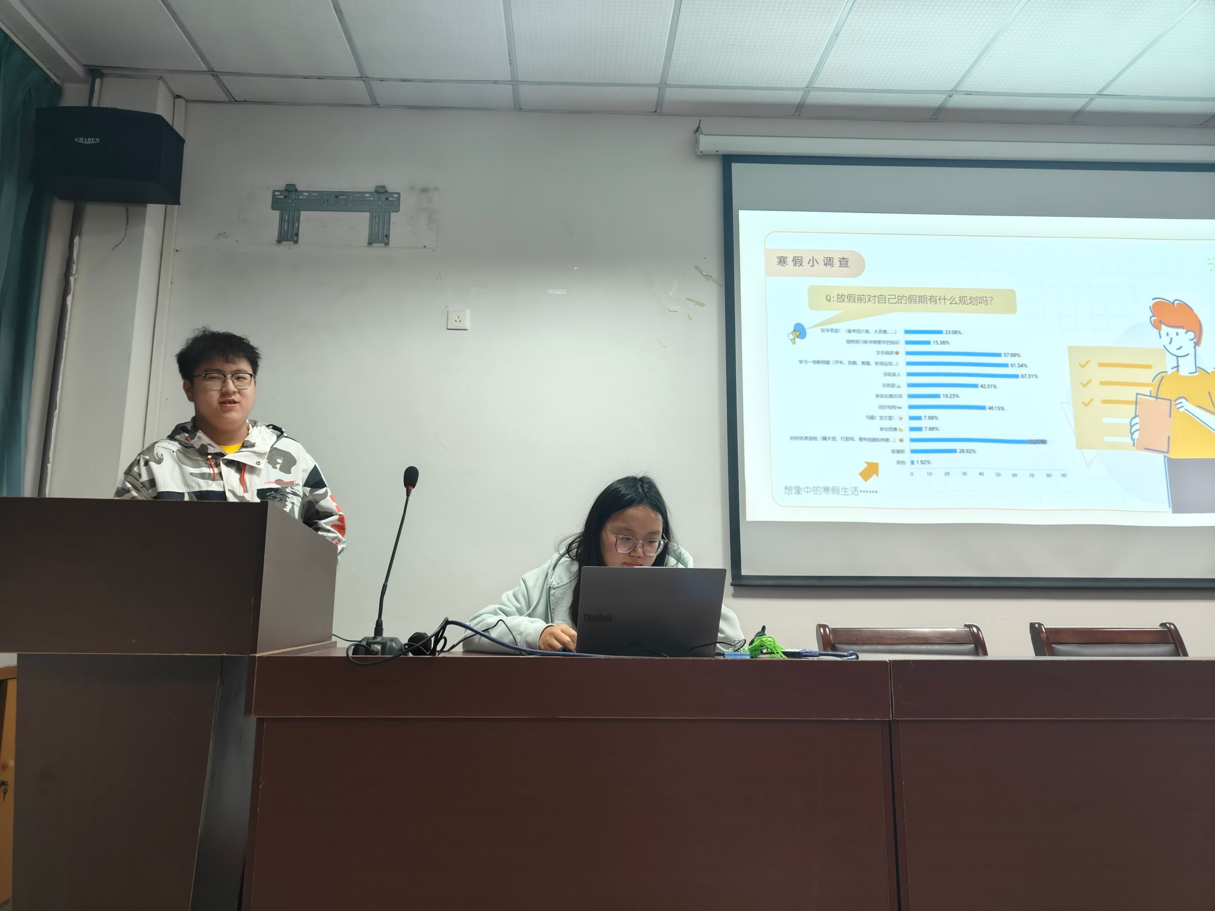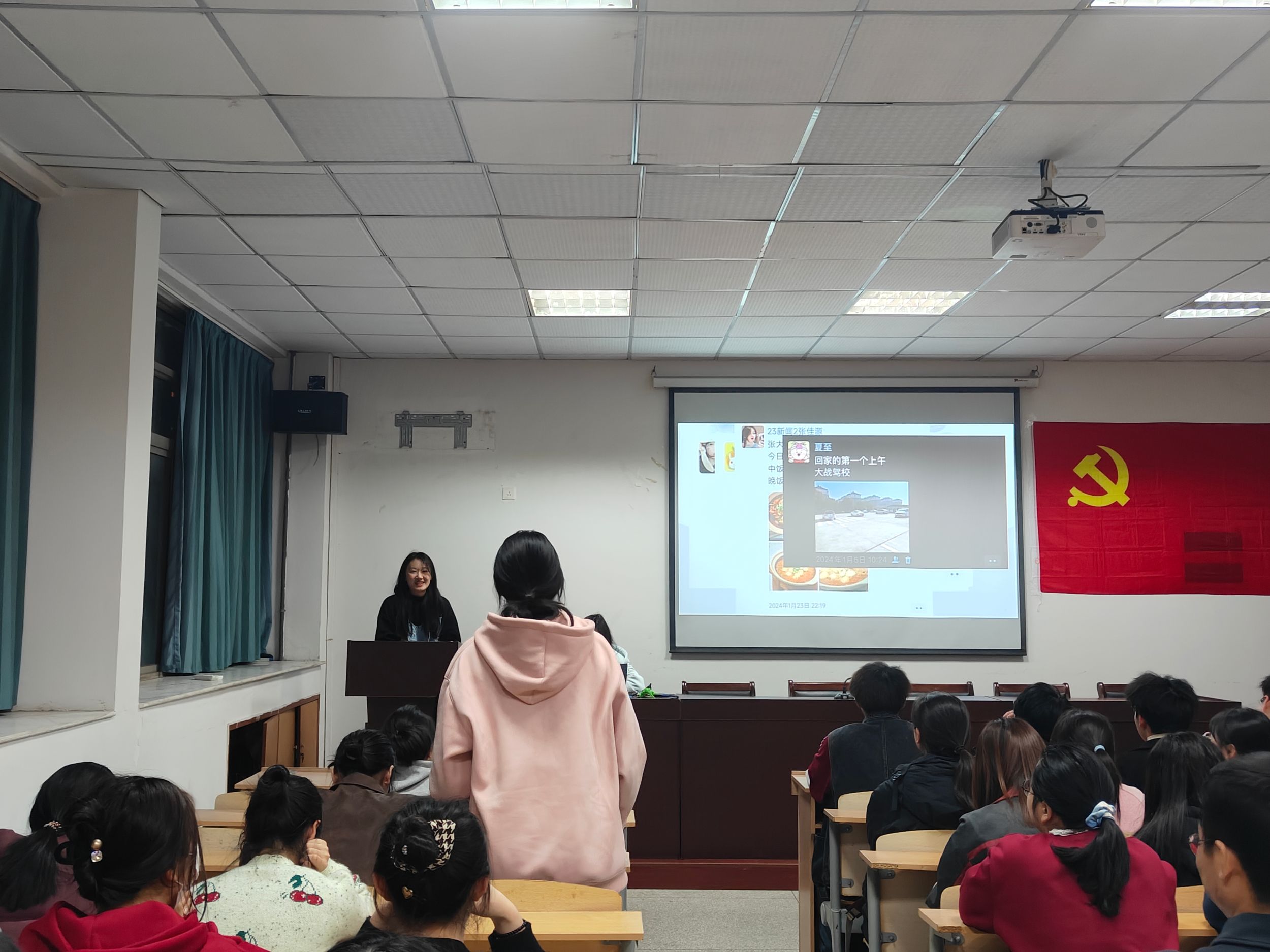 团小组组长王鸿杨结合班级同学寒假生活小调查进行分享,94%的同学对于自己的假期生活表示满意态度,大多数同学在假期生活中与家人度过了非常美好的时光,得到了充分的休息,也进行了一些阅读,学习了新的技能,还有部分同学进行了兼职体验。刘海婷同学上台向大家分享了感受颇多的兼职体验,走近了一线,体会了人情的冷暖,意义颇深。黄佳慧同学则分享了自己寝室团建南京之旅,与家人、朋友相聚,回看母校的温情寒假生活。