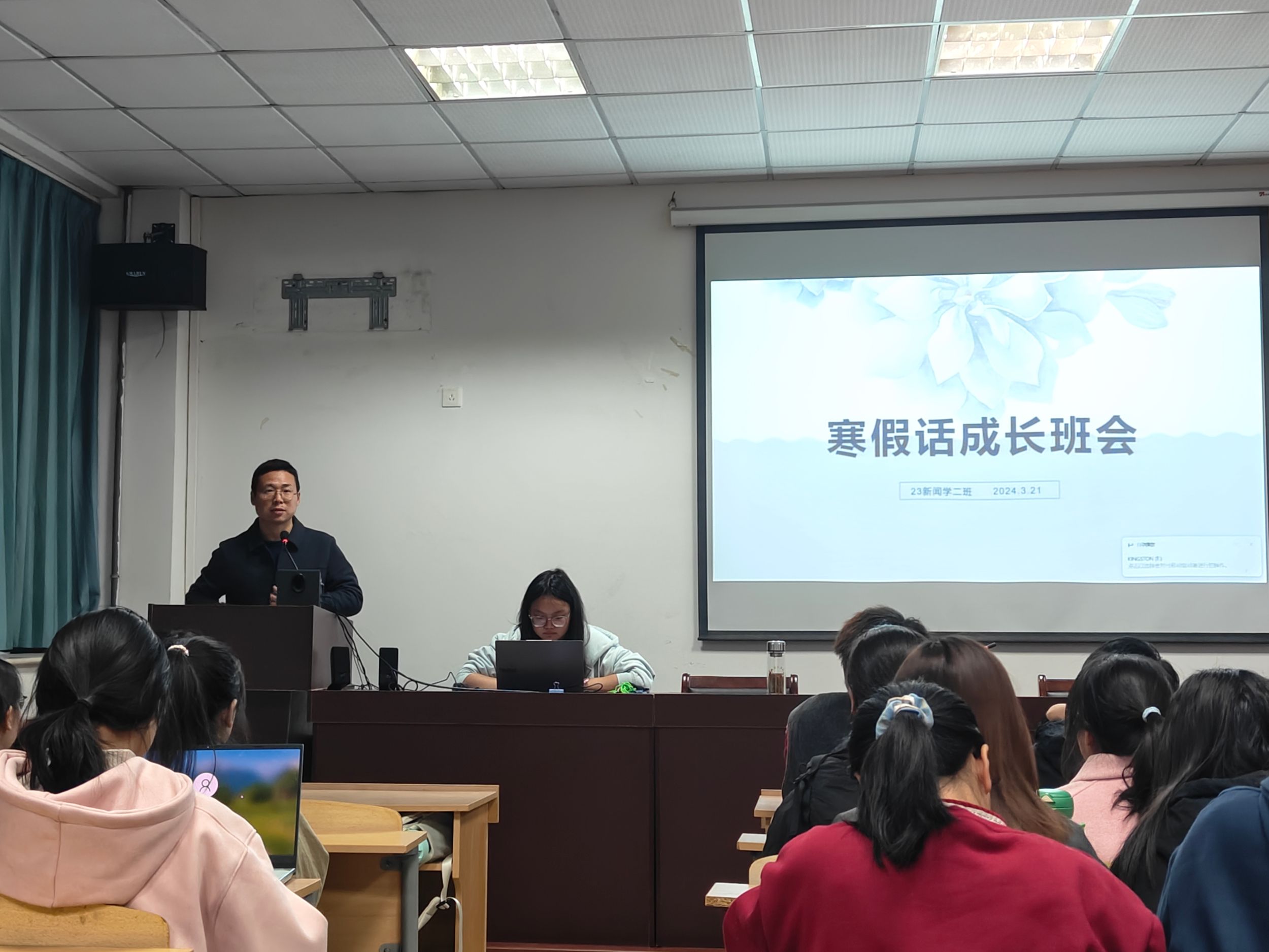 3月21日晚,2023级新闻学二班召开寒假回来话成长暨春季安全教育主题班会,辅导员马星宇与全体二班同学共同参与,班会由组织委员王依纯主持。