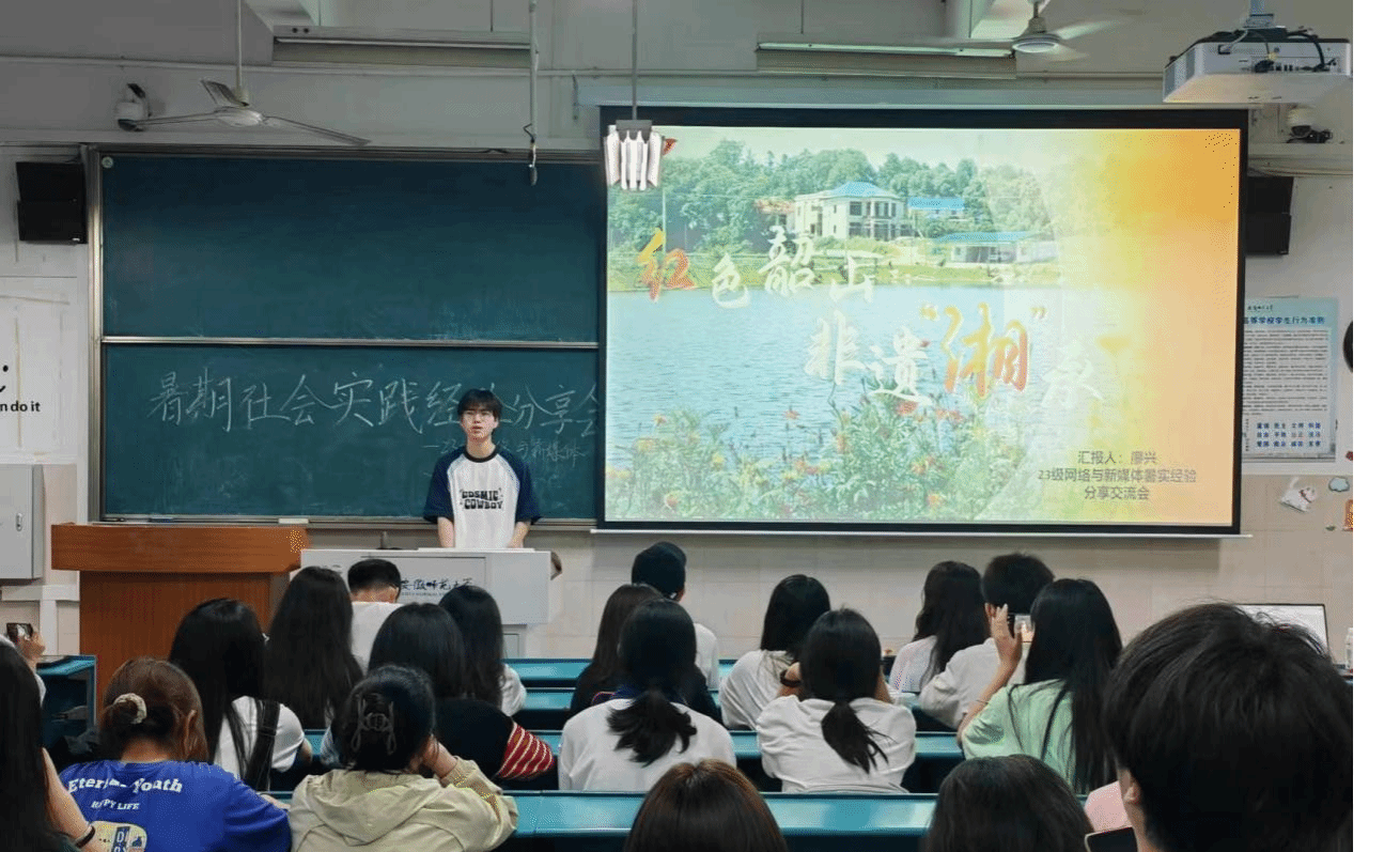 为更好地解决班级同学对于暑期社会实践的相关疑惑,2023级网络与新媒体专业在辅导员汪笑笑和全体班委的共同组织下,邀请了2021级播音与主持艺术专业刘赜玮、2022级网络与新媒体专业廖兴面向全班同学开展了暑期社会实践经验交流会。