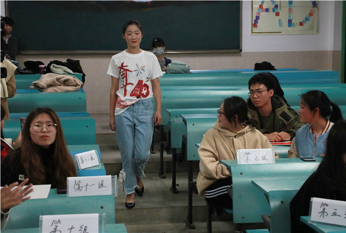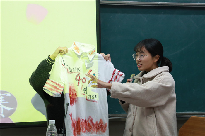 经过各评委的层层选拔后,共有十二组选手进入复赛。在这一轮中,选手们首先需要依此上台讲解服装创作理念。通过“青春”、“中国”、“改革开放”这几大关键词,结合各自的创新思维,阐述各自的创作历程。有选手直接将自己设计的帽子带在头上,让评委们更加直观地感受到制成品的实用性;还有的选手介绍自己采用了“断舍离”的创作理念。自信的讲解与清晰的思路,选手们的卓越风采都让评委们留下了深刻印象。第二环节是年代秀答题。主办方提前设置了许多与改革开放有关的题目,选手们现场快速答题,成绩计入总分。问题有易有难,简单时,选手们胸有成竹地举起答案板;而困难时,选手们则进行热烈的小组讨论。第三个环节是服装展示T台秀,由播音与主持艺术专业同学担任模特,穿上同学们精心设计的服装,伴着音乐声缓缓走到台前,向各位评委及同学诠释服装散发出的无穷魅力。