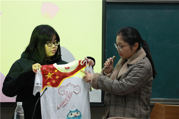 在形象设计大赛初赛中,女生部提前发送信息通知参赛选手比赛时间及地点,并将收集好的旧衣服及购置的道具材料送到比赛现场。比赛过程中,选手们充分利用自己所带的材料与主办方提供的手工品,有的选择用画笔与颜料将白色T恤涂绘上与主题相关联的文字、图案,有的将纽扣、蕾丝等装饰品运用针线缝纫使服装增添趣味,有的把两件衣物拼接在一起形成新的创意……参赛者们不停地发挥自己的想象力与创造力,小组成员们相互讨论,以求革新进步。在服装改造过程中,不仅小组成员间彼此协助,不同小组间也友好互动,一起使用颜料,共同研讨调色盘使用技巧。据悉,初赛参加人员共计一百余人,提交了三十余份作品。每位参赛者都在活动中体验到了自己动手的快乐以及完成作品后的满足。