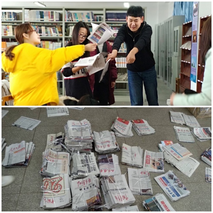2016级新闻二班同学在3月5日至11日期间,开展了一系列校园志愿服务事项。首先进行的是义务整理学院资料室工作。寒假期间送来的报纸与书籍夹杂一通,着实让学生们看花了眼、席不暇暖。在负责老师张力的指导下,同学们有条不紊地对一月到三月的各种报纸进行分门归类。