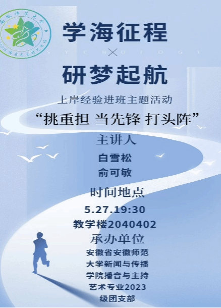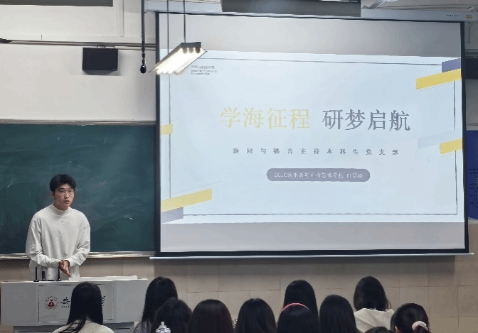 为进一步增强党员的责任感和使命感,强化党员的宗旨意识,充分发挥党员的先锋模范作用,新闻与播音主持本科生党支部主办了“学海征程,研梦启航”上岸经验进班主题分享会,5月27日晚,23级播音班承办了该项活动,该班委邀请了20级推免优秀学长学姐白雪松、俞可敏和21广告学专业张子昂进行了学习经验和参赛经验分享。