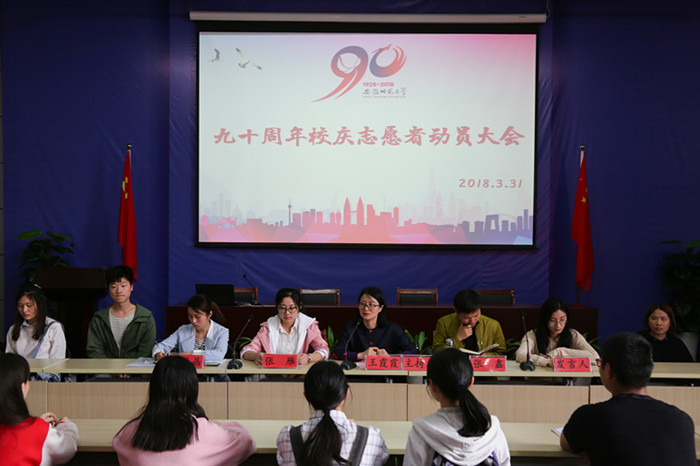 2016级广告学专业贾皖豫作为校庆志愿者代表发言提出,作为一名校庆志愿者,践行志愿者奉献、有爱、互助的精神与理念,为学校争光,为校庆添彩就是最大的目的与动力。在接下来的工作当中,将以最饱满的精神和良好的风貌,投入到校庆志愿服务中去,为师大九十周年校庆庆典工作贡献力量。