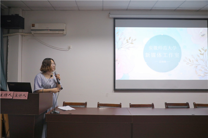 新媒体运营也是如今开展社会调查必不可缺的项目。朱敏从微博基本格式、微博话题、优秀微博标准三个方面解答了如何进行微博运营的问题。她用过往的优秀案例截图让在座同学直观地了解并记住“#微博话题#+【内容概要】+微博正文+@账号”的发表格式,她提醒团队微博要注意跟共青团中央学校部、中国青年网等官微和当地官微互动,增加影响力。岳晓婧在向大家介绍了安师大新媒体工作室的相关工作后,则开始了她对微信运营的分享。微信制作包括创意策划、文案编写、素材收集、文章排版、封图制作、后台操作六个内容,制作负责人需熟练掌握软件操作,也要富有创新和审美思维,同时她建议微信文案要少排比、慎引用、少呼吁、多互动。岳晓婧总结微信制作要达到“情怀”、“丰富”、“互动”、“官方”、“创意”相融合相促进的效果。