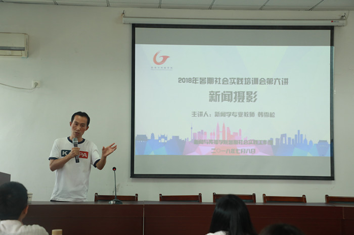 会上,韩雪松从技术与构图两大方面展开,对摄影时常遇到的聚焦、曝光控制、光位、感光度、角度选择等问题作出了详细解答。他结合教学经验与实际案例,强调了画面稳定与画面留白的重要性。在谈到往年暑期实践照片中所存在的问题时,他指出拍照时须注重反映主题,尽可能多地采用中景或近景的拍摄方式,要学会抓拍动态、神态来突出被摄对象。