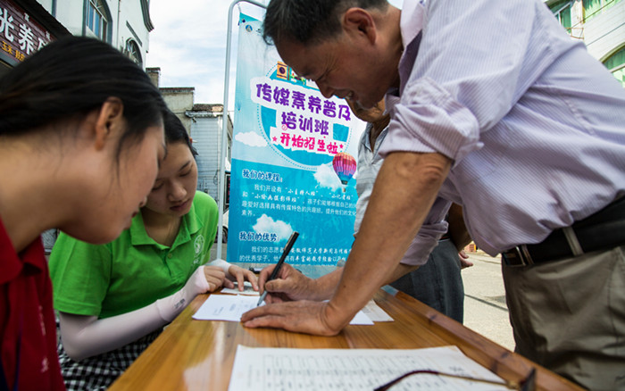 传媒素养普及培训班招生工作于上午7时在溪口镇政府前开展,除了定点招生咨询外,还有一批队员深入周边社区,积极主动地选择性地向当地居民介绍培训班的基本情况,宣传课程内容设置。队员们围绕“年龄段为7-11岁孩子”、“义务支教”、“兴趣”和“与学生其他课程时间是否冲突”等关键词进行宣传。向家长们讲解培训班各项安排,鼓励孩子们报名参与传媒素养培训班。