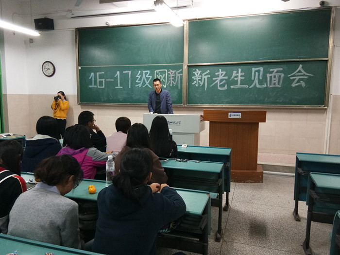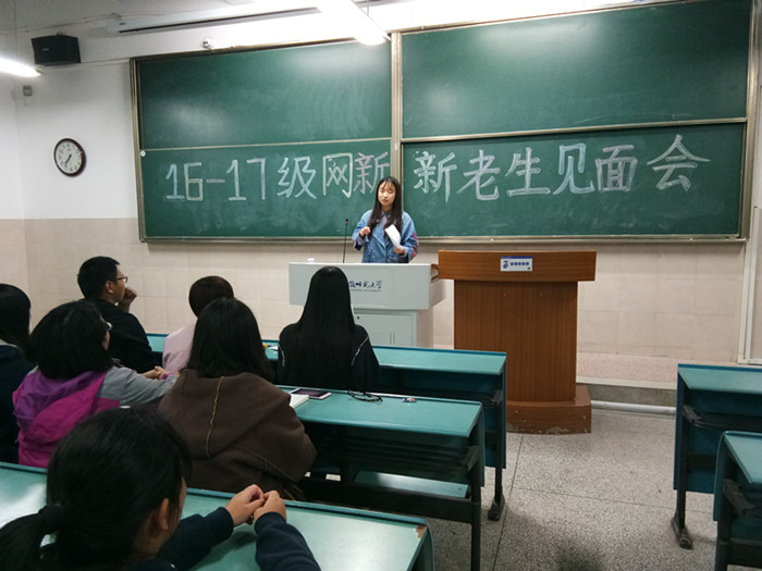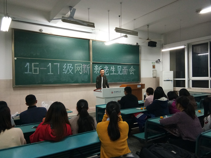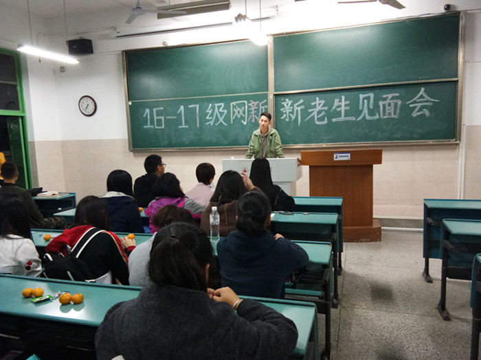 2017年10月16日晚在2050302教室开展16级和17级网新专业的新老生见面会, 16网新的部分班委以及17网新全体同学参加了本次会议。16级网新胡胜和17级赵柳明主持了本次见面会。