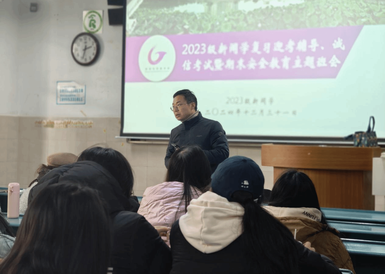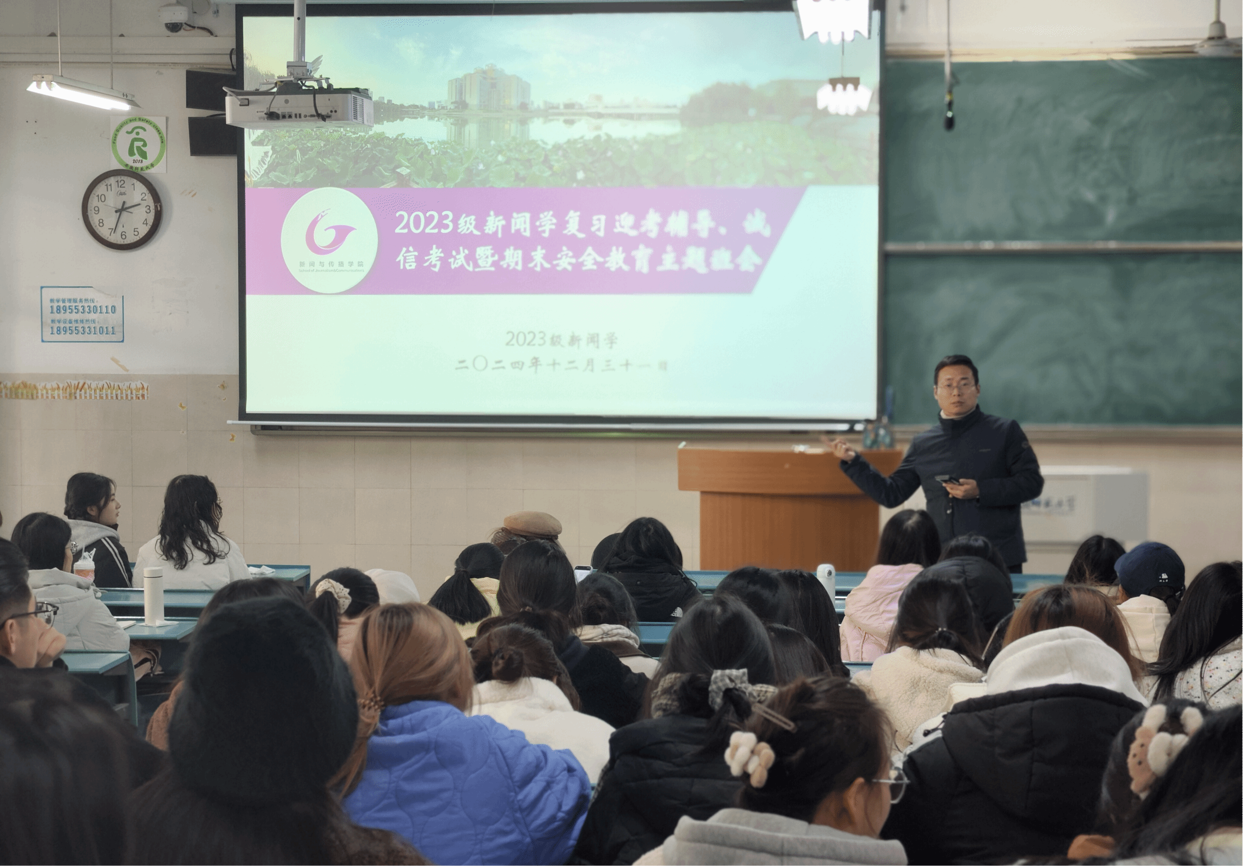 12月31日下午,2023级新闻学专业的同学们齐聚2040301教室,召开复习迎考辅导、诚信考试暨期末安全教育主题班会。此次班会由辅导员马星宇主持,旨在为同学们敲响期末考试的纪律警钟,全力营造公平公正的考试环境,同时进一步筑牢大家的安全意识。同时,也就近期专业课程复习迎考做了备考辅导、压力疏导。