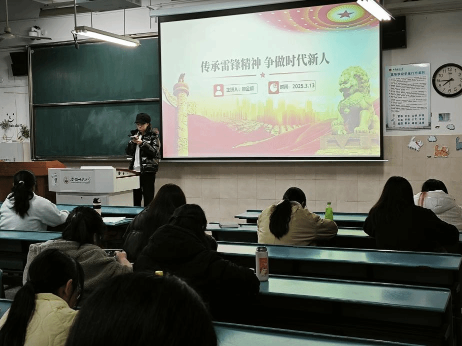 视听启航:沉浸式感受雷锋精神力量。活动在激昂的《学习雷锋好榜样》歌声中拉开帷幕,伴随着雷锋事迹图片的轮播,同学们重温了这位平凡英雄的感人故事。在主题学习环节,微视频《新时代雷锋精神的N种打开方式》展现了当代青年参与社区服务、乡村振兴、生态保护的生动实践,引发热烈讨论。随后的知识讲解中,通过时间轴梳理雷锋成长轨迹,结合"螺丝钉精神""为人民服务"等经典语录的当代诠释,系统解析了雷锋精神"忠诚、奉献、敬业、创新、互助"的五大核心内涵,使抽象精神具象化为可践行的行动指南。