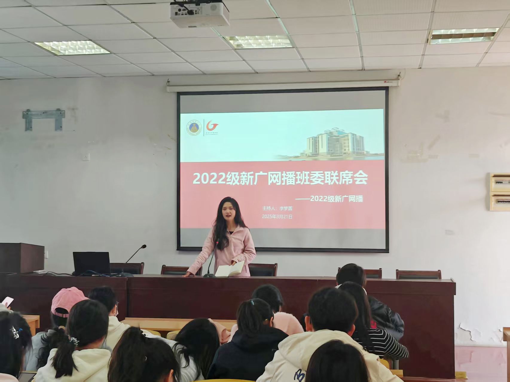 本网讯(文/江丹扬 图/吴悠然)为进一步提高班委工作效率、增强班委成员责任感和凝聚力,促进班集体全面高质发展,2025年3月20日中午1点,2022级新闻学、广告学、网络与新媒体、播音与主持艺术专业班委联席会议于院楼406会议室顺利召开。2022级新广网播5个班级全体55位班委参与,会议由辅导员李梦圆主持。