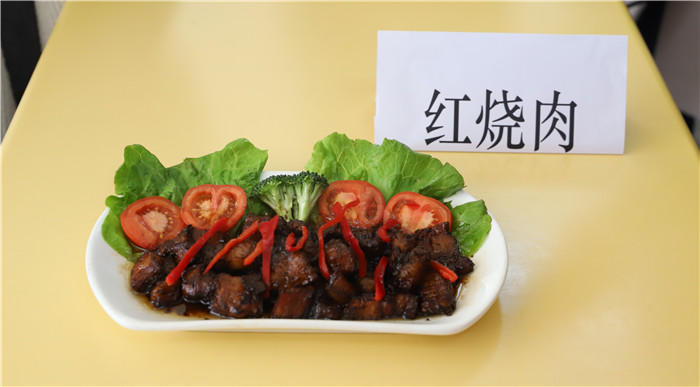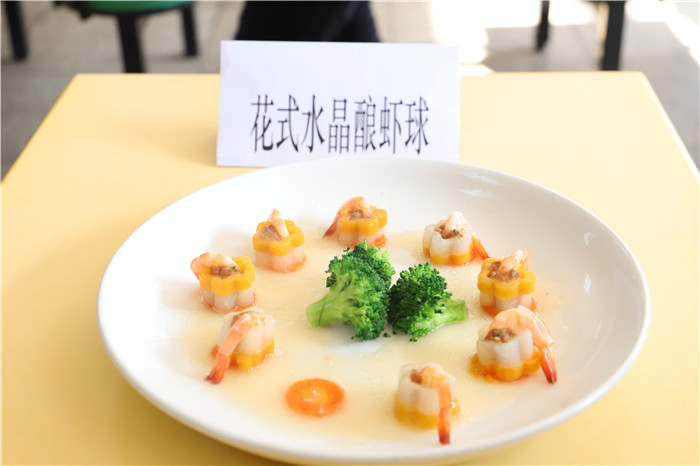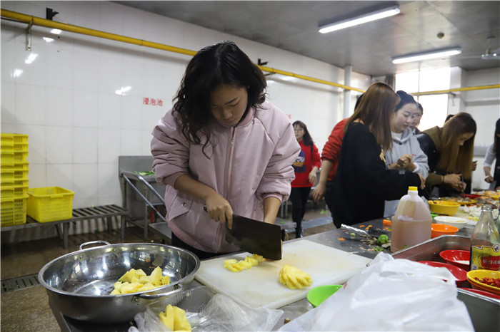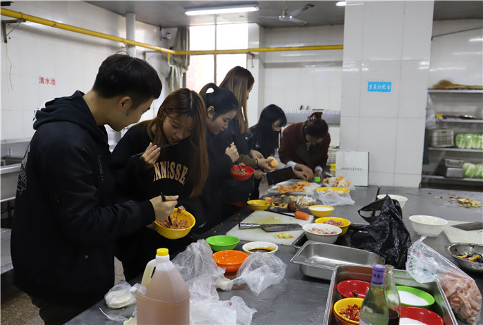 食堂后厨的材料琳琅满目、一应俱全,参赛的同学拥有充足的资源大展身手。比赛开始后,以班级为单位的比赛队员们分工明确,洗菜,择菜,切菜等准备工作均有条不紊地进行着,气氛十分热烈。准备好的食材刚与锅壁“亲密接触”,厨房里便传出浓郁的香味儿;外面,一双双筷子早已等好,等待着厨房内的最终成果。最后,每个小组都相应完成了自己的作品,桌子上有做工精巧、摆盘用心的山东水饺;有色香味俱全的土豆排骨;有酸甜可口、色泽诱人的菠萝咕咾肉;有油而不腻的红烧肉;有外焦里嫩的红烧鸡翅;还有让人眼前一亮的创意菜品花式水晶酿虾球……每盘菜从厨房端出都是精彩。