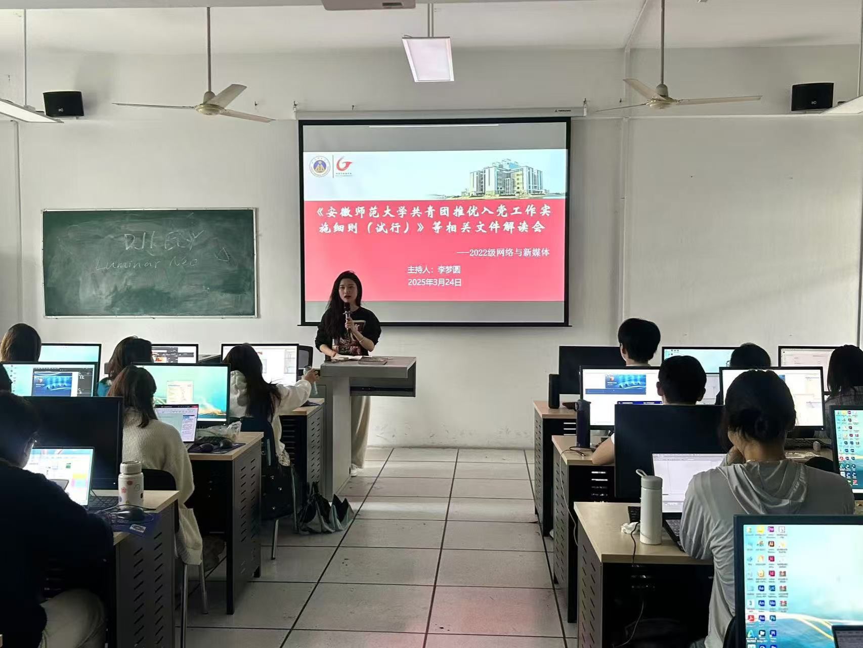 为有序推进共青团推优入党工作,切实加强党对青年工作的领导,引导广大青年积极向党组织靠拢,3月24日下午,2022级新闻学、广告学、网络与新媒体、播音与主持艺术专业在辅导员李梦圆的带领下开展了《bat365在线中国登录入口共青团推优入党工作实施细则(试行)》等相关文件解读会。此次活动聚焦推优入党的各项要求与流程,为怀揣着入党热忱、渴望投身党的伟大事业的同学们照亮前行之路。