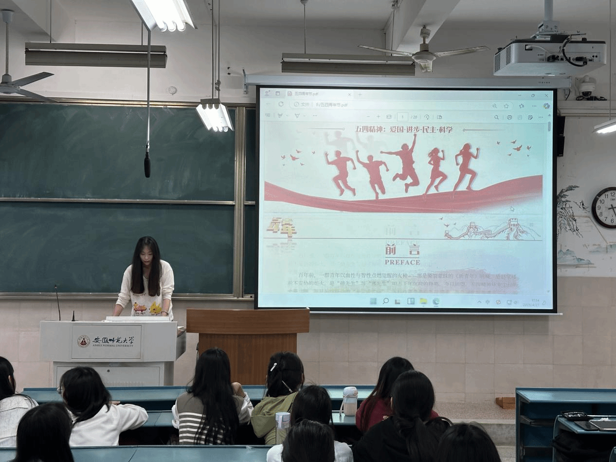 于海涛从四个方面对五四精神进行了详细讲解。她从历史溯源切入,指出五四运动孕育了以“爱国、进步、民主、科学”为主要内容的伟大五四精神,这场运动不仅是反帝反封建的伟大爱国革命运动,更是中国近现代史上具有里程碑意义的重大事件。在精神解构部分,她强调五四精神的核心是爱国主义,同时包含民主与科学精神、改革创新精神等,五四运动推动了思想解放,激发了青年的爱国热情和创新精神。在当代价值方面,她指出,五四精神是新时代青年的精神指引,激励着广大青年为实现中华民族伟大复兴的中国梦而不懈奋斗。五四精神的核心是爱国主义,它体现了青年对国家命运的深切关怀和对民族复兴的责任担当。同时,五四精神也为培育和践行社会主义核心价值观提供了重要载体。五四运动所倡导的民主与科学精神,是社会主义核心价值观的重要体现,它引导青年树立正确的世界观、人生观和价值观。通过传承五四精神,新时代青年能够在强国建设、民族复兴的伟大征程中,以实际行动展现青春作为,贡献青春力量。最后,在传承路径部分,她呼吁同学们要将五四精神内化于心、外化于行,鼓励大家在日常生活中践行爱国、进步、民主、科学的价值观,积极参与社会实践,勇于创新创造,用实际行动传承和弘扬这一宝贵的精神财富,让五四精神在新时代绽放更加绚丽的光芒。