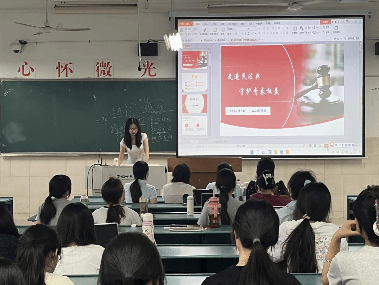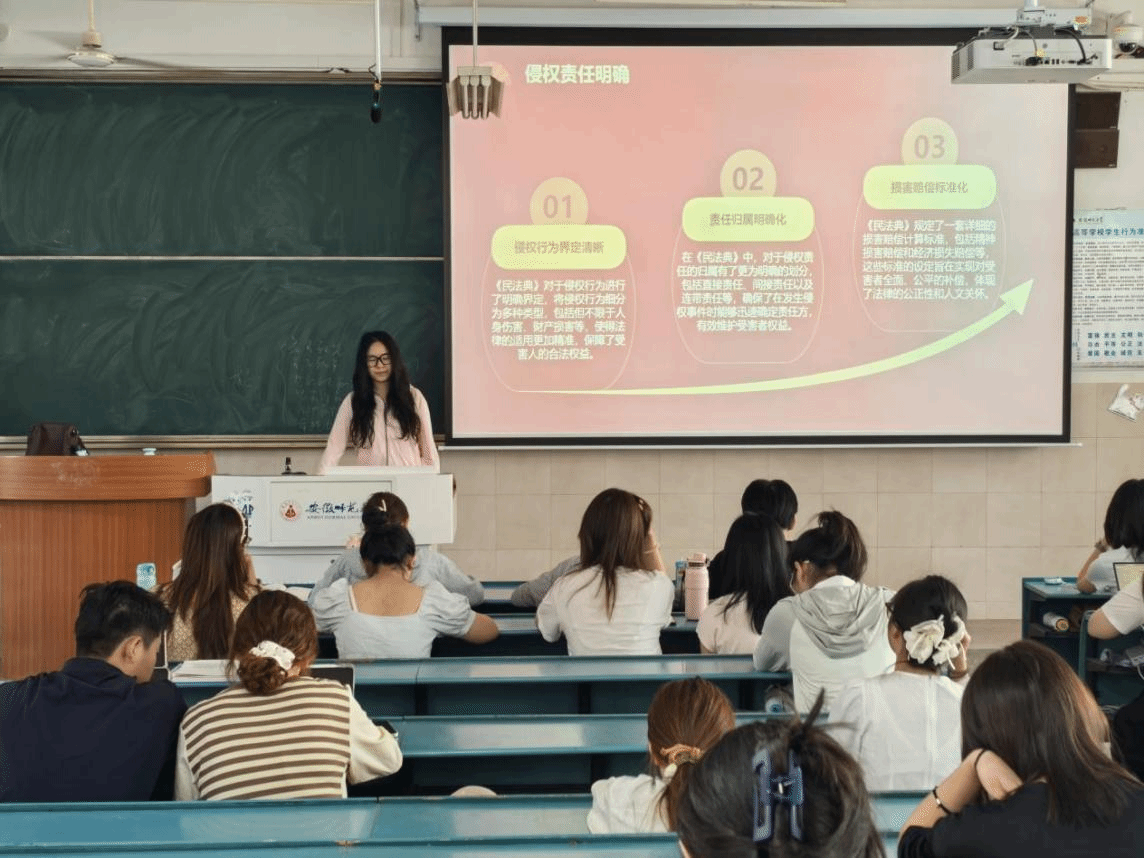 各班思政委员简要介绍了民法典的制定背景和重要意义,强调其对公民权益的全面保障作用,并结合校园生活实例,重点讲解了与大学生密切相关的法律知识,包括人格权保护、合同签订注意事项以及继承相关法规,使同学们熟悉民法典中关于民事权利保护的条款。