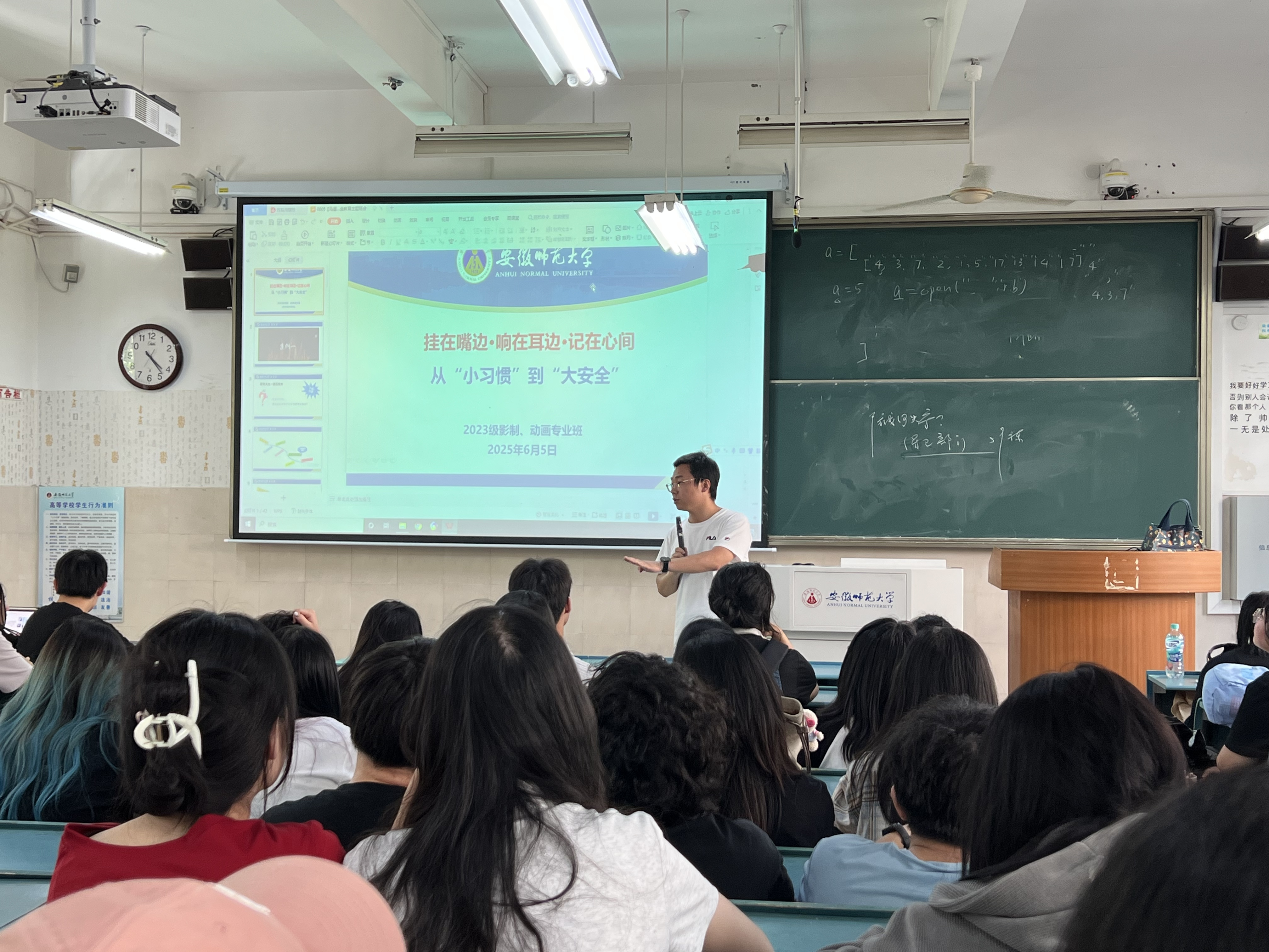 为了强化同学们的安全意识,提升学生安全防范能力,营造和谐校园环境。6月5日下午,23级影视摄影与制作、23级动画专业共同召开校园安全主题班会。马星宇老师围绕校园安全类型、安全意识习惯、安全防范举措等展开深入讲解。