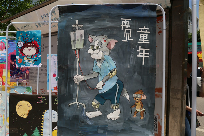 展览的作品分为手绘版和电子版两大部分。手绘版充满了传统韵味,色彩丰富,而电子版则充分运用PHOTOSHOP、INDESIGN等软件进行制图,构图精巧细致,让人眼前一亮。每个作品都可谓是匠心独具,有些作品巧妙地采用了“书画结合”的方式,如作品《童稚之逸》,化用了白居易的《池上》,以两个在荷塘嬉戏的孩童为主体,并将诗句附于画旁——“小娃撑小艇,偷采白莲回。不解藏踪迹,浮萍一道开”,画中有诗,别有意趣。有些作品则凭寓意取胜,如作品《再见童年》,作者用老多病的汤姆猫和拄着拐棍、白发苍苍的老鼠杰瑞比喻一去不复返的童年,让人唏嘘感叹。