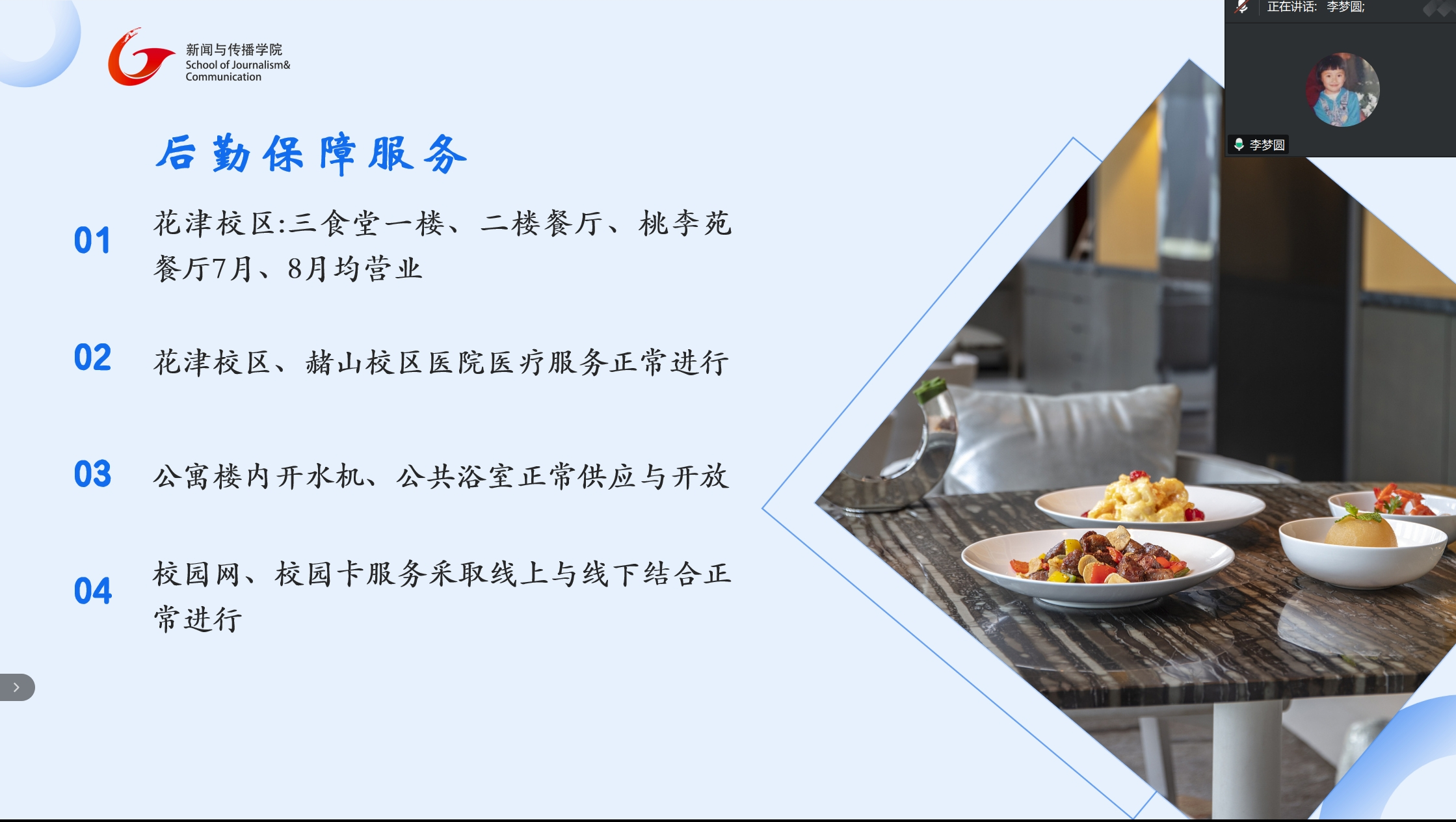 会上,李梦圆就学校后勤保障情况向同学们告知在校饮食、自习教室等相关安排,并结合身边的案例提醒同学们注意宿舍安全、消防安全、交通安全、网络安全、严防电信诈骗等,并提醒同学们保持讯息畅通、按时进行晚打卡等注意事项。