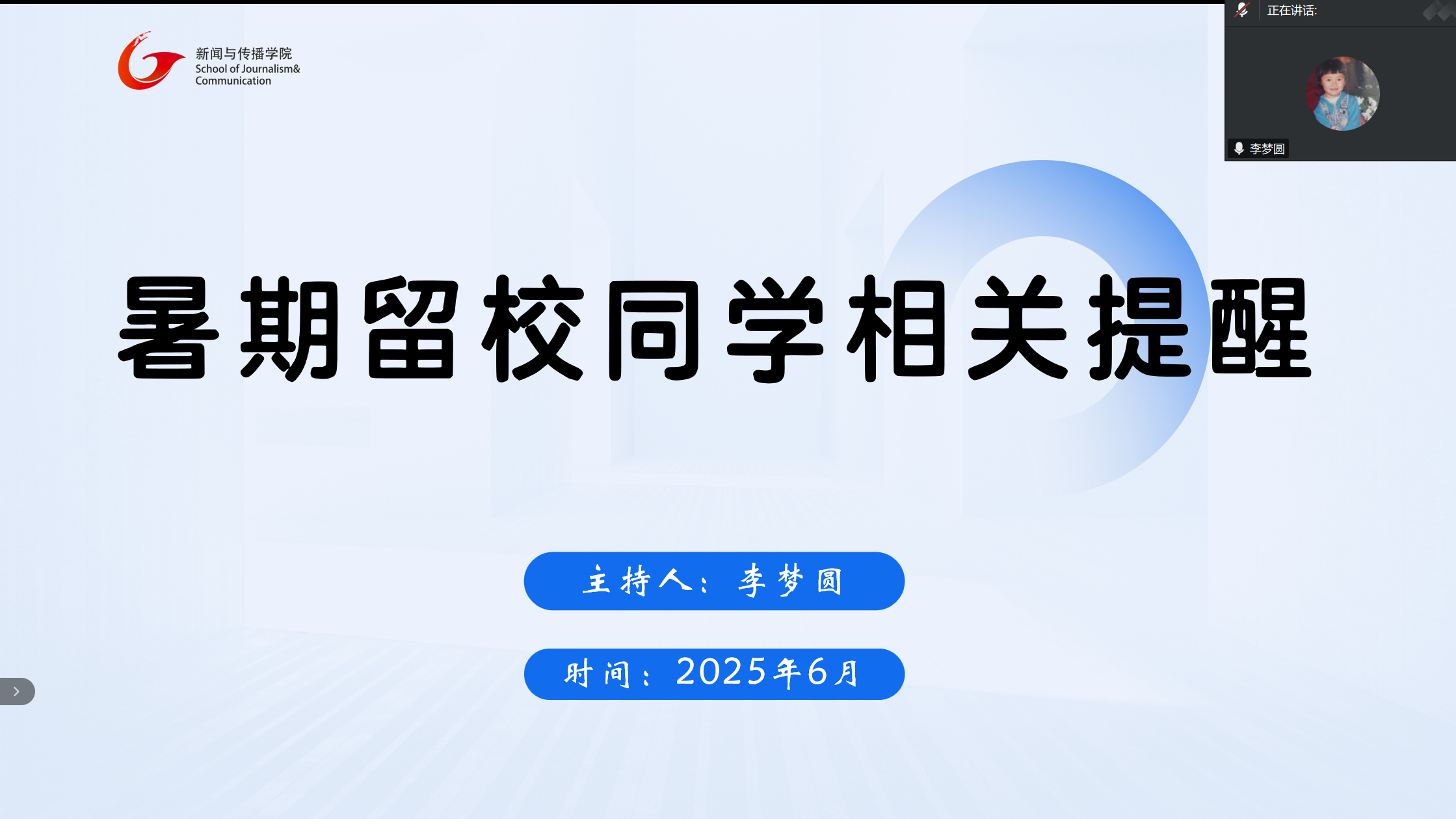 2022级新闻学、广告学、网络与新媒体、播音与主持艺术专业于2025年6月28日召开暑期留校安全教育主题班会,辅导员李梦圆和2022级新广网播各专业暑期留校学生参会。