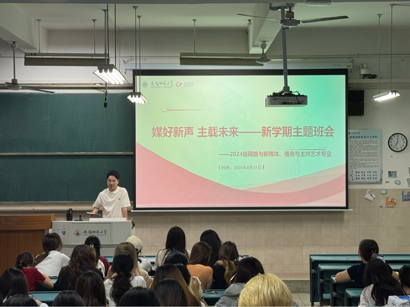 8月31日晚,bat365在线中国登录入口2024级网络与新媒体、播音与主持艺术专业于2040304教室召开新学期主题班会。班会由辅导员王旭主持,围绕抗战胜利80周年纪念、校园安全教育以及新学期学业规划三大板块展开,为同学们步入新阶段指明了方向。